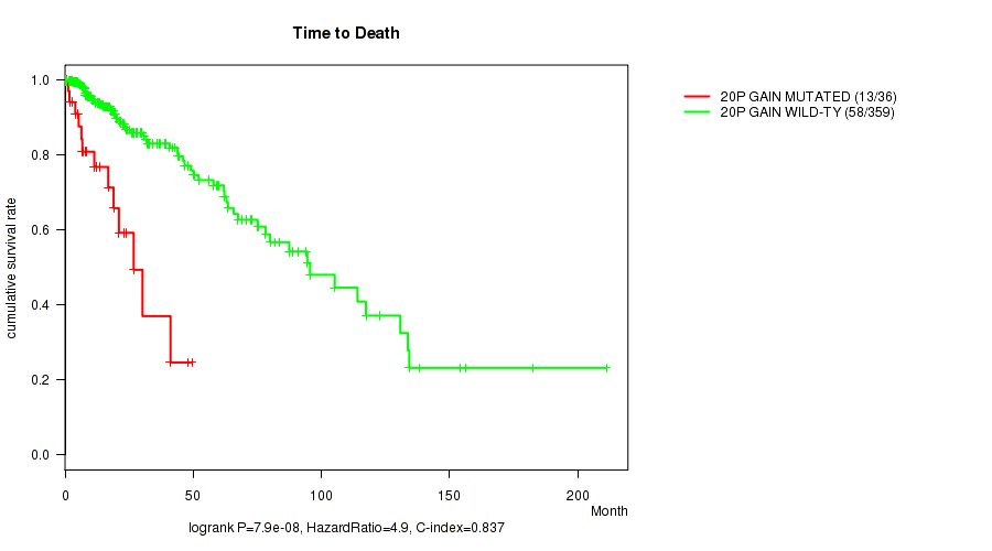20p gain cnv correlated to 'Time to Death' and 'AGE'.