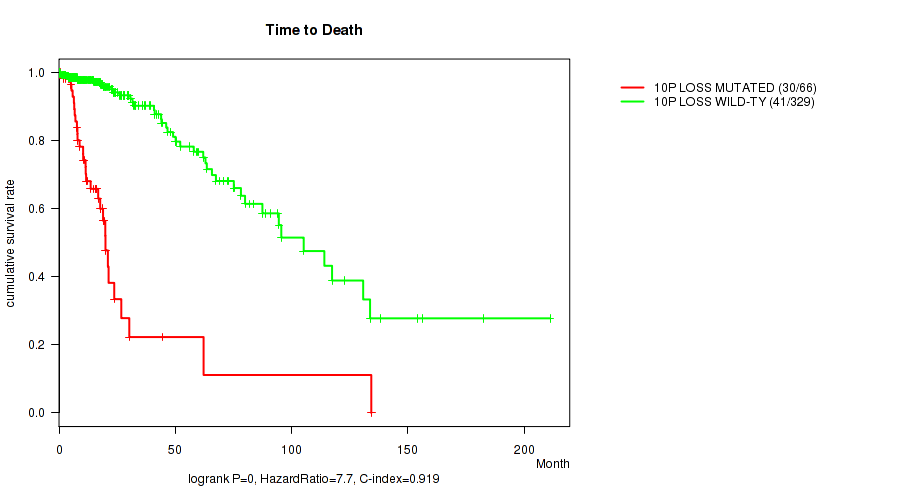 10p loss cnv correlated to 'Time to Death', 'AGE', and 'HISTOLOGICAL.TYPE'.