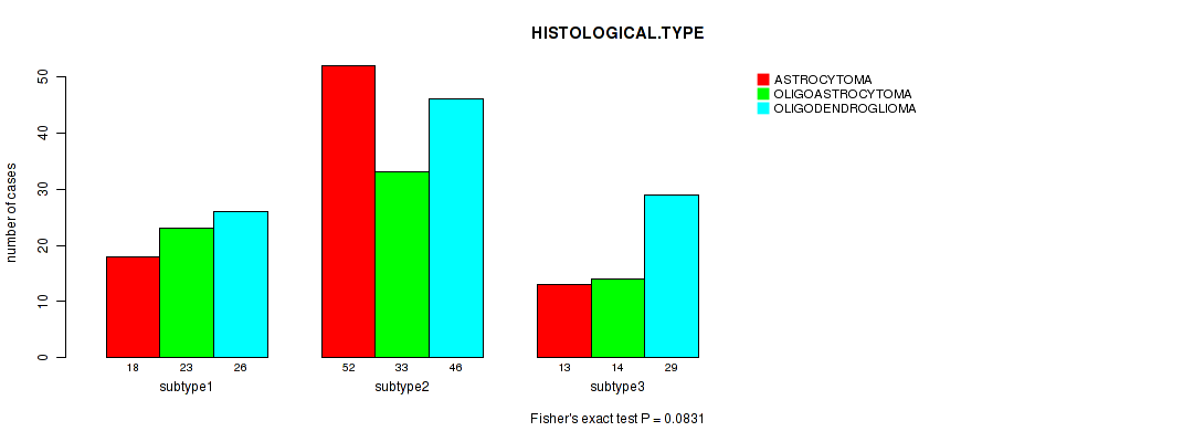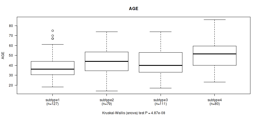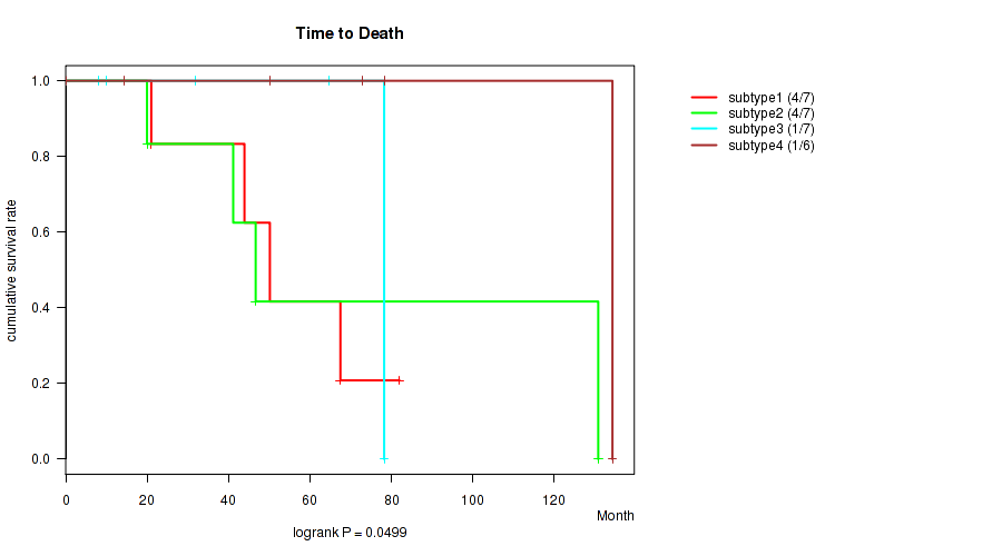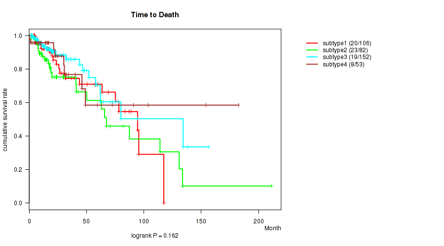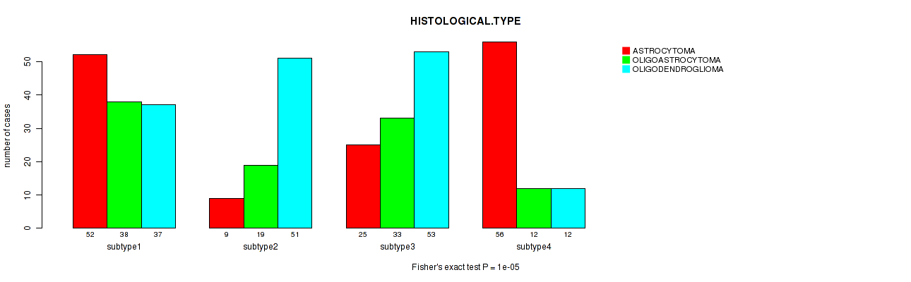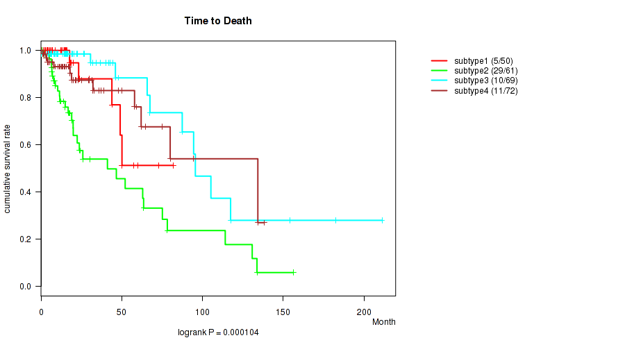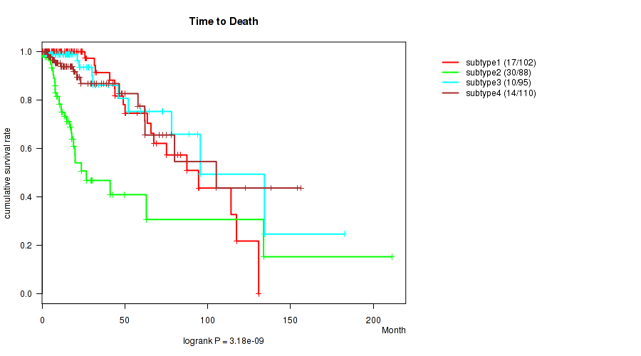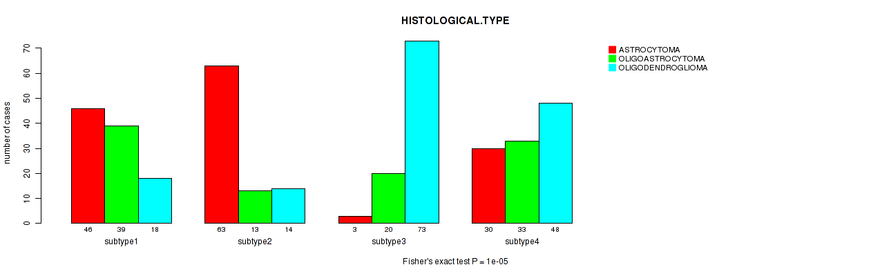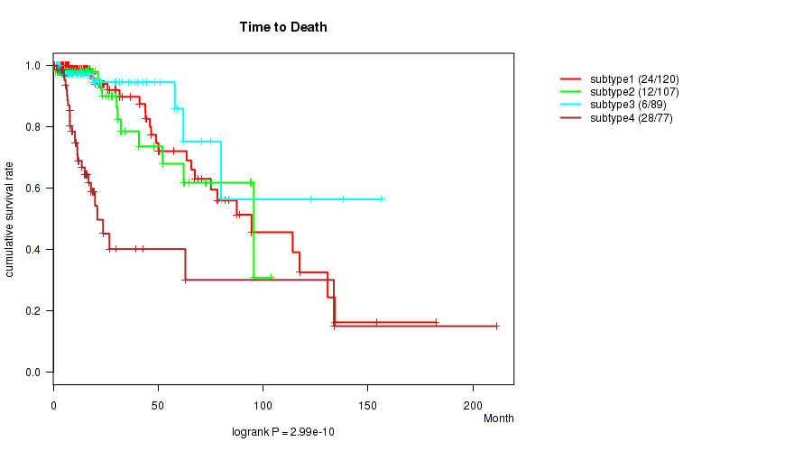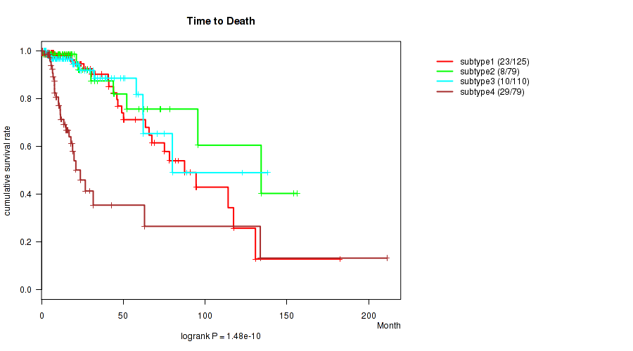 Consensus hierarchical clustering analysis on sequencing-based mRNA expression data identified 4 subtypes that correlate to 'Time to Death', 'AGE', 'KARNOFSKY.PERFORMANCE.SCORE', and 'HISTOLOGICAL.TYPE'.