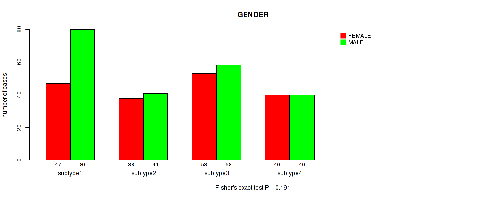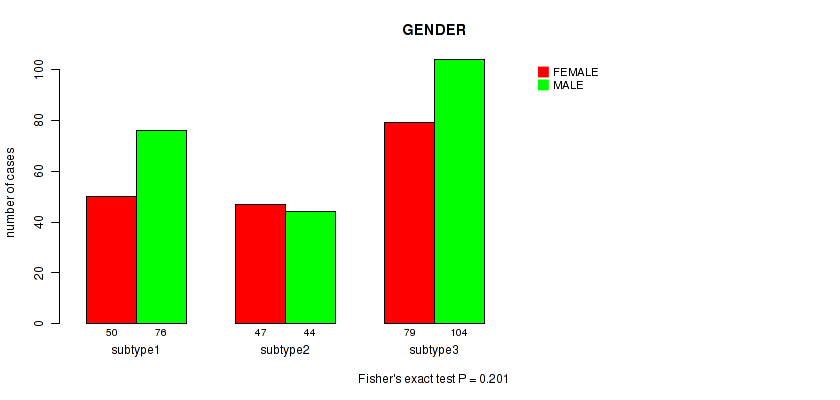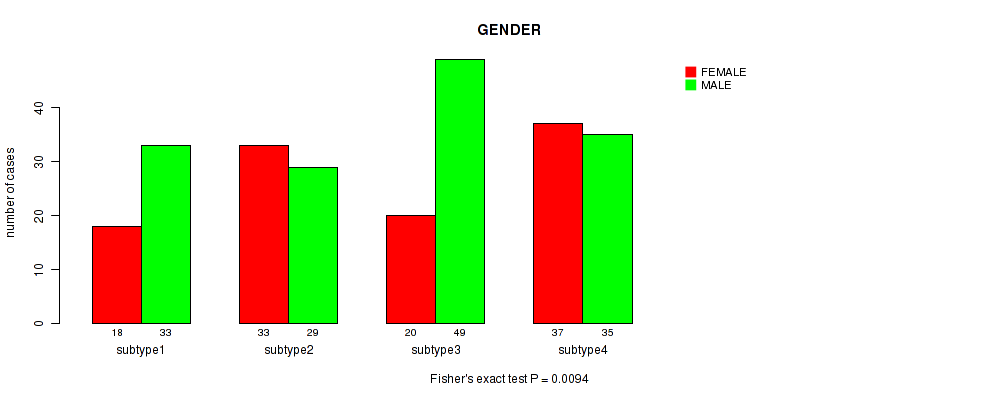 Table S103. Clustering Approach #12: 'MIRseq Mature cHierClus subtypes' versus Clinical Feature #3: 'GENDER'