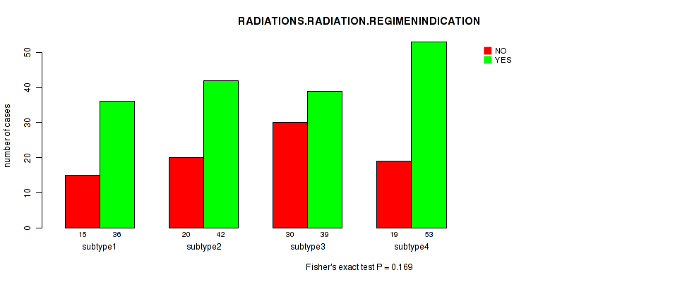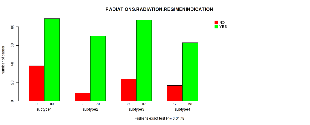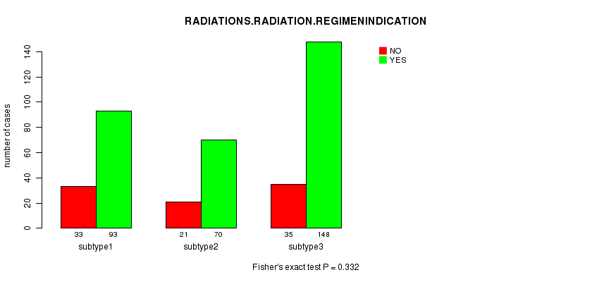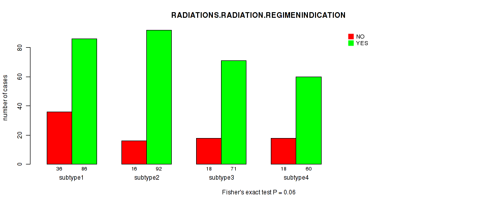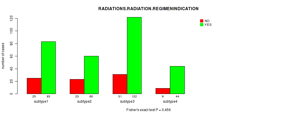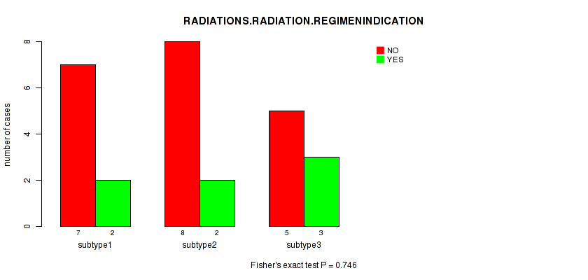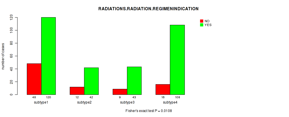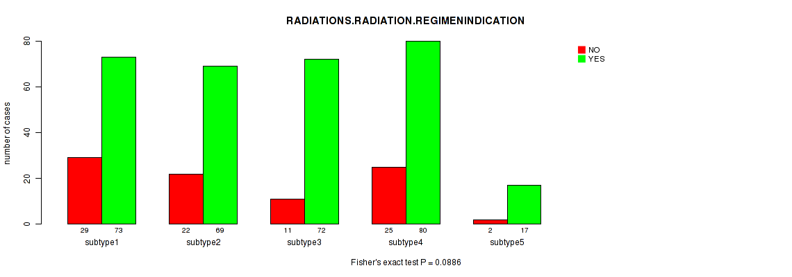 Figure S86. Get High-res Image Clustering Approach #11: 'MIRseq Mature CNMF subtypes' versus Clinical Feature #6: 'RADIATIONS.RADIATION.REGIMENINDICATION'