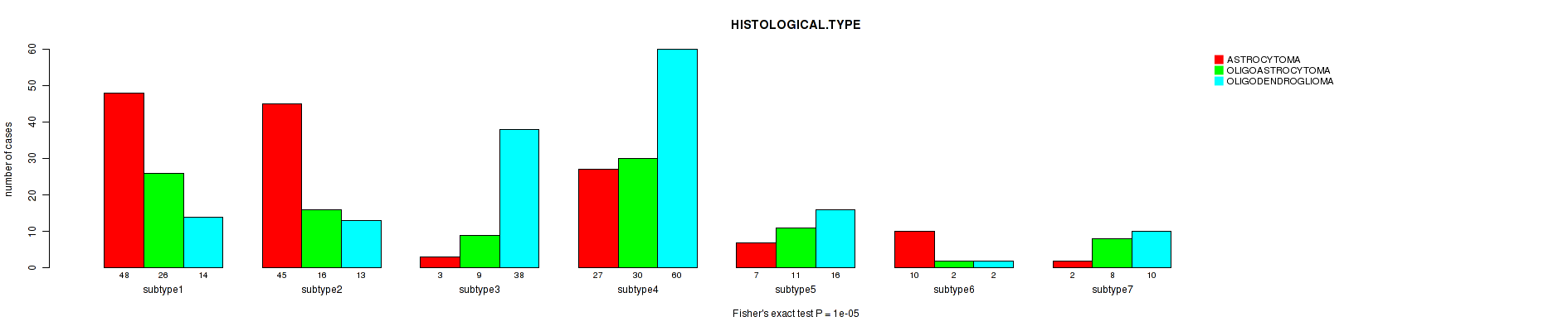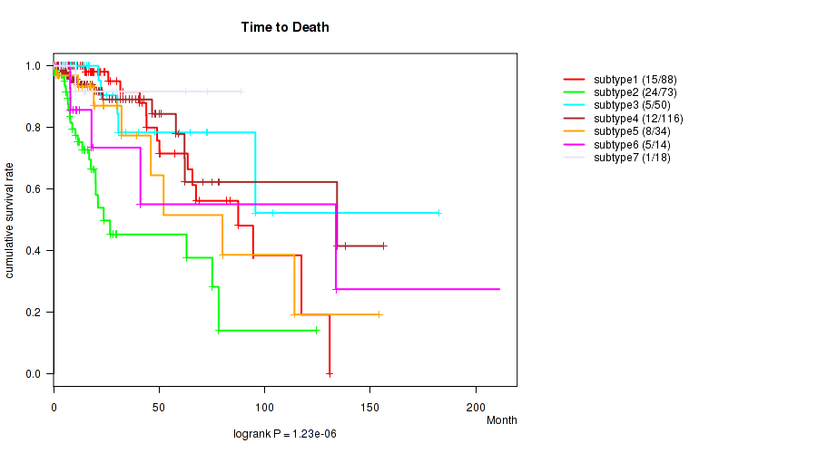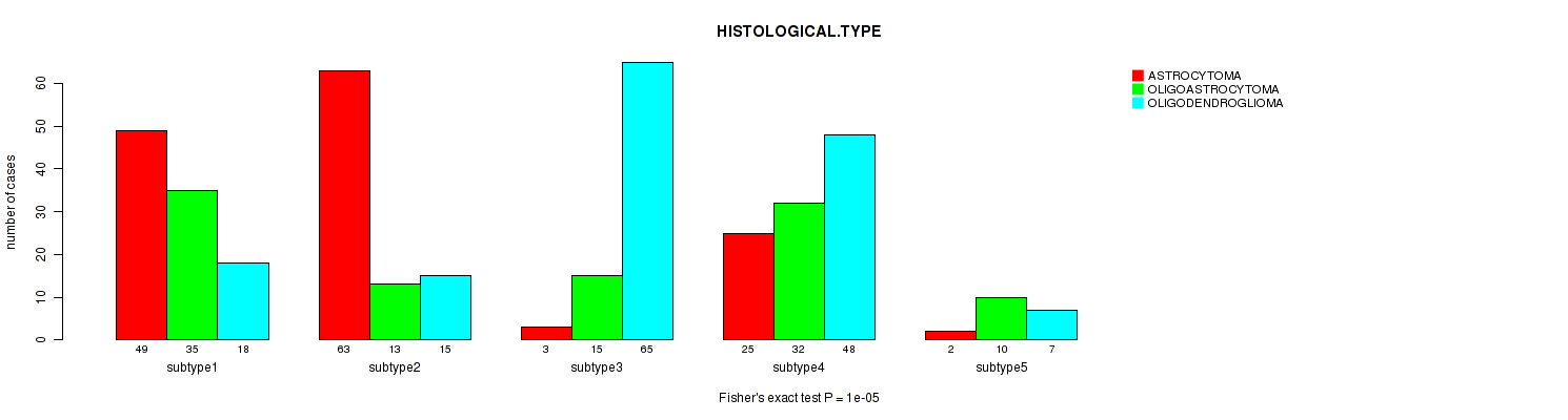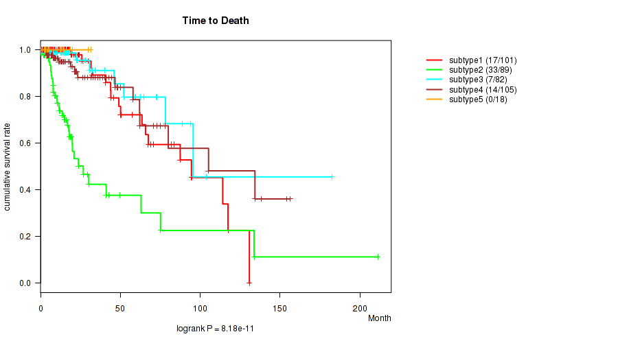 CNMF clustering analysis on sequencing-based mRNA expression data identified 5 subtypes that correlate to 'Time to Death', 'AGE', 'KARNOFSKY.PERFORMANCE.SCORE', and 'HISTOLOGICAL.TYPE'.