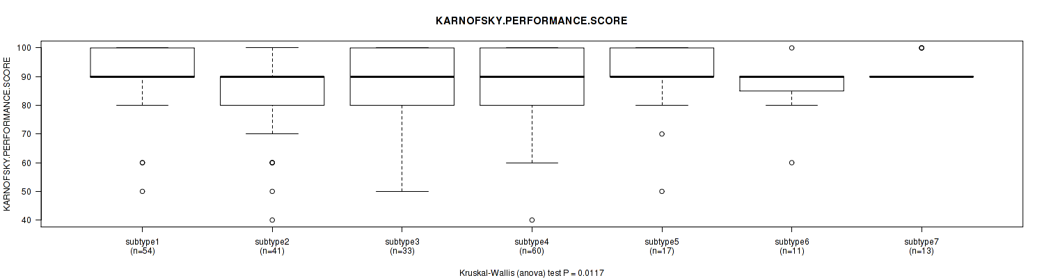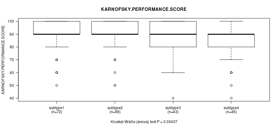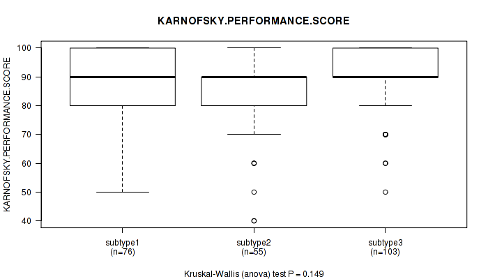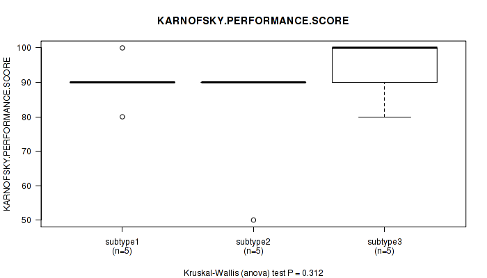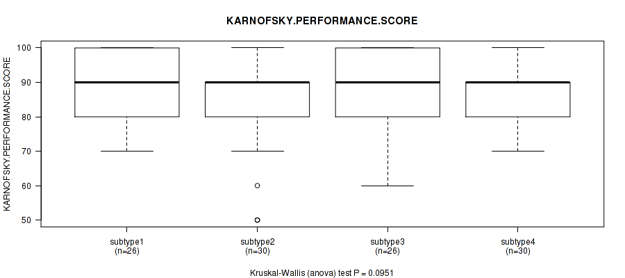 Figure S92. Get High-res Image Clustering Approach #12: 'MIRseq Mature cHierClus subtypes' versus Clinical Feature #4: 'KARNOFSKY.PERFORMANCE.SCORE'