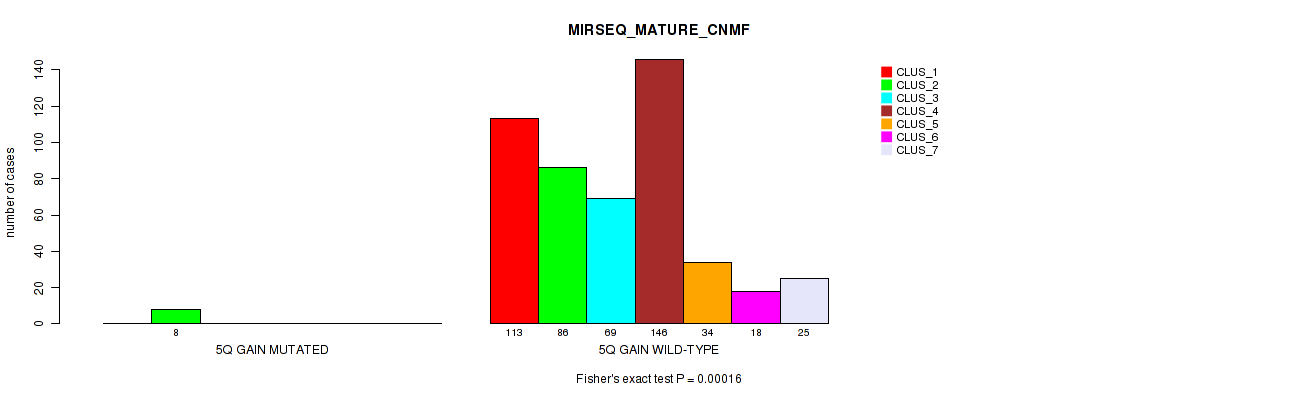 • 5q gain cnv correlated to 'METHLYATION_CNMF',  'MRNASEQ_CNMF',  'MRNASEQ_CHIERARCHICAL', and 'MIRSEQ_MATURE_CNMF'.