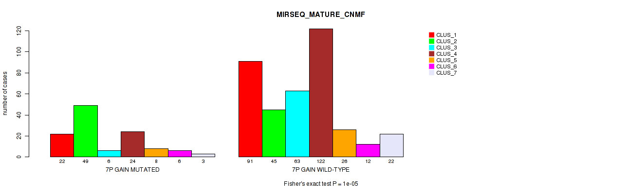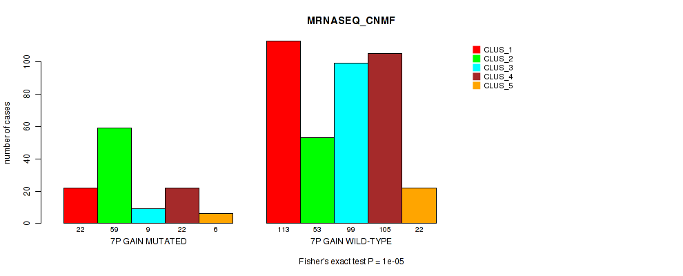 • 7p gain cnv correlated to 'CN_CNMF',  'METHLYATION_CNMF',  'RPPA_CNMF',  'MRNASEQ_CNMF',  'MRNASEQ_CHIERARCHICAL',  'MIRSEQ_CHIERARCHICAL',  'MIRSEQ_MATURE_CNMF', and 'MIRSEQ_MATURE_CHIERARCHICAL'.