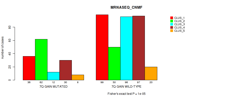• 7q gain cnv correlated to 'CN_CNMF',  'METHLYATION_CNMF',  'MRNASEQ_CNMF',  'MRNASEQ_CHIERARCHICAL',  'MIRSEQ_CHIERARCHICAL',  'MIRSEQ_MATURE_CNMF', and 'MIRSEQ_MATURE_CHIERARCHICAL'.