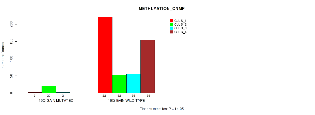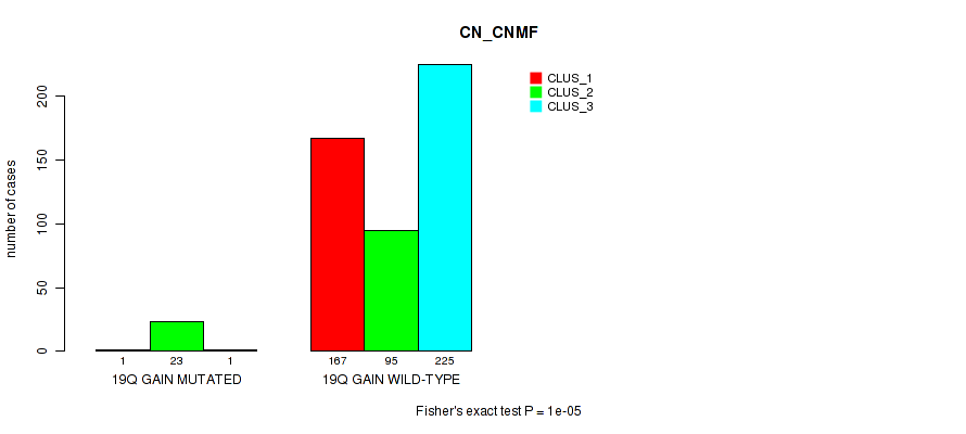 • 19q gain cnv correlated to 'CN_CNMF',  'METHLYATION_CNMF',  'MRNASEQ_CNMF',  'MRNASEQ_CHIERARCHICAL',  'MIRSEQ_CHIERARCHICAL',  'MIRSEQ_MATURE_CNMF', and 'MIRSEQ_MATURE_CHIERARCHICAL'.