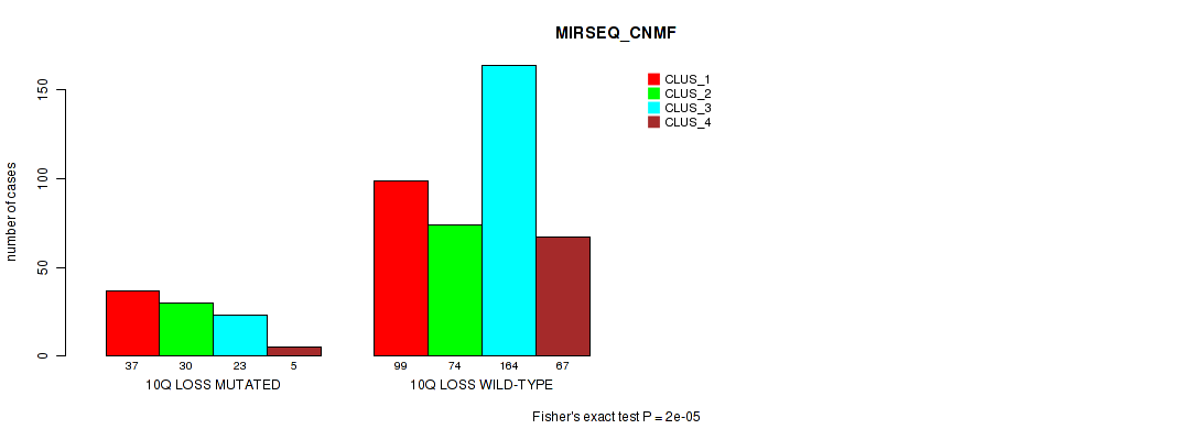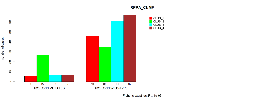 • 10q loss cnv correlated to 'CN_CNMF',  'METHLYATION_CNMF',  'RPPA_CNMF',  'MRNASEQ_CNMF',  'MRNASEQ_CHIERARCHICAL',  'MIRSEQ_CNMF',  'MIRSEQ_CHIERARCHICAL',  'MIRSEQ_MATURE_CNMF', and 'MIRSEQ_MATURE_CHIERARCHICAL'.