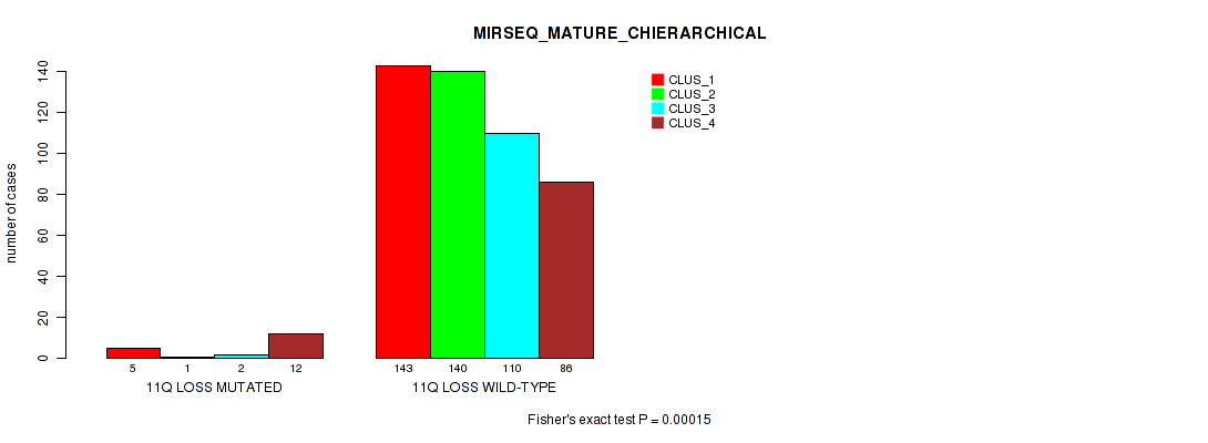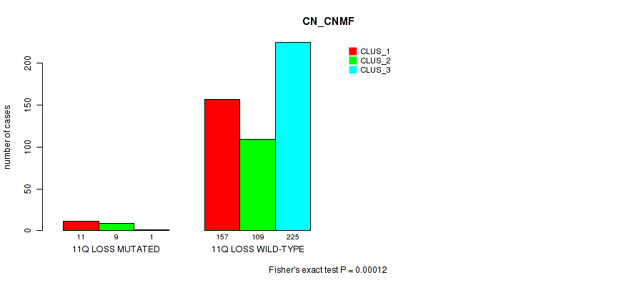 • 11q loss cnv correlated to 'CN_CNMF',  'METHLYATION_CNMF',  'MRNASEQ_CNMF',  'MRNASEQ_CHIERARCHICAL', and 'MIRSEQ_MATURE_CHIERARCHICAL'.