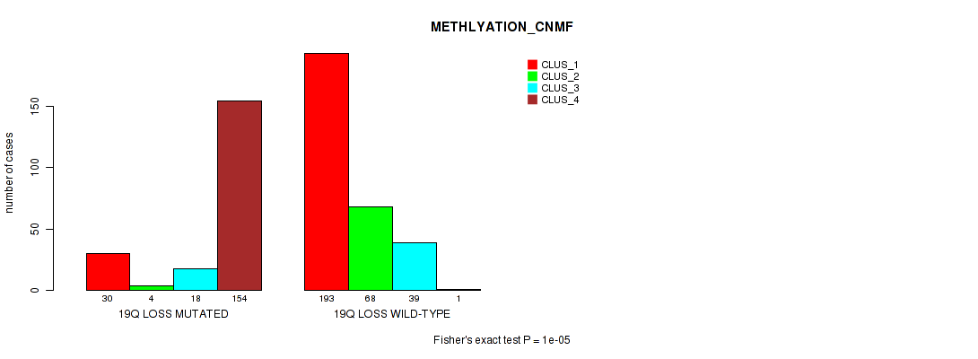 • 19q loss cnv correlated to 'CN_CNMF',  'METHLYATION_CNMF',  'MRNASEQ_CNMF',  'MRNASEQ_CHIERARCHICAL',  'MIRSEQ_CNMF',  'MIRSEQ_CHIERARCHICAL',  'MIRSEQ_MATURE_CNMF', and 'MIRSEQ_MATURE_CHIERARCHICAL'.