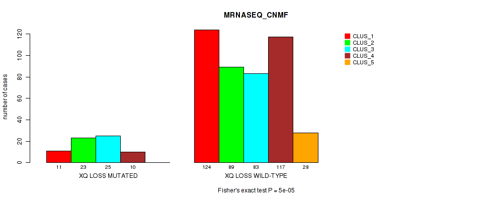 • xq loss cnv correlated to 'MRNASEQ_CNMF',  'MRNASEQ_CHIERARCHICAL',  'MIRSEQ_MATURE_CNMF', and 'MIRSEQ_MATURE_CHIERARCHICAL'.