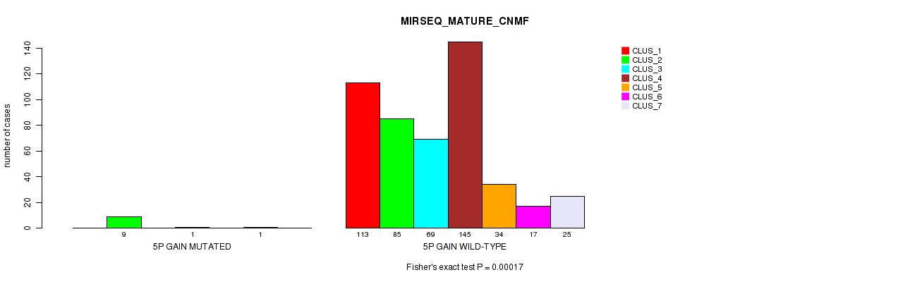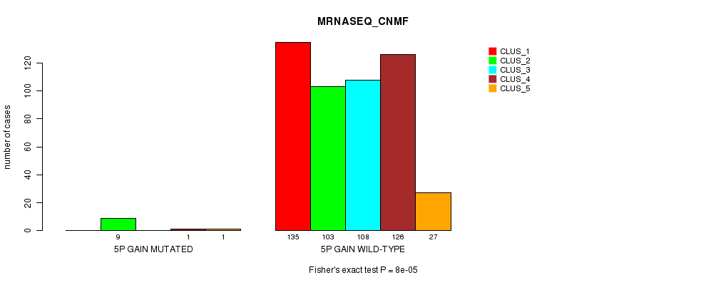 • 5p gain cnv correlated to 'MRNASEQ_CNMF',  'MRNASEQ_CHIERARCHICAL', and 'MIRSEQ_MATURE_CNMF'.