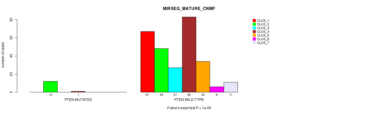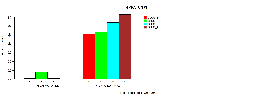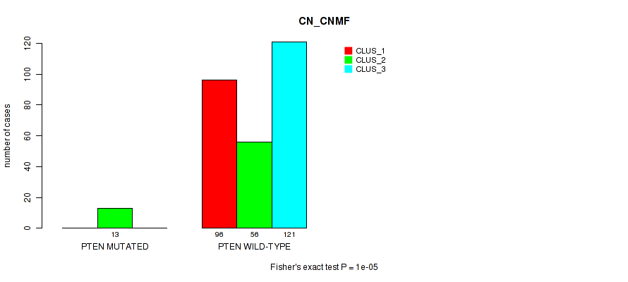• PTEN mutation correlated to 'CN_CNMF',  'METHLYATION_CNMF',  'RPPA_CNMF',  'MRNASEQ_CNMF',  'MRNASEQ_CHIERARCHICAL',  'MIRSEQ_CHIERARCHICAL',  'MIRSEQ_MATURE_CNMF', and 'MIRSEQ_MATURE_CHIERARCHICAL'.