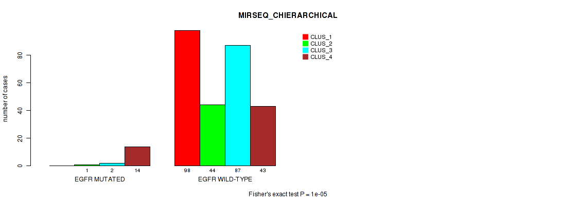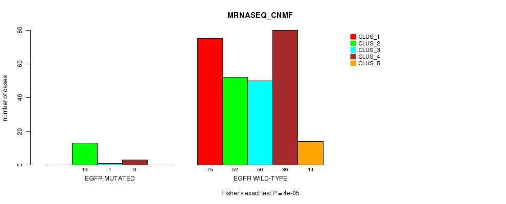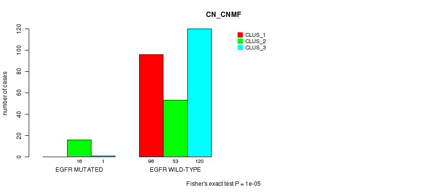 • EGFR mutation correlated to 'CN_CNMF',  'METHLYATION_CNMF',  'MRNASEQ_CNMF',  'MRNASEQ_CHIERARCHICAL',  'MIRSEQ_CHIERARCHICAL',  'MIRSEQ_MATURE_CNMF', and 'MIRSEQ_MATURE_CHIERARCHICAL'.