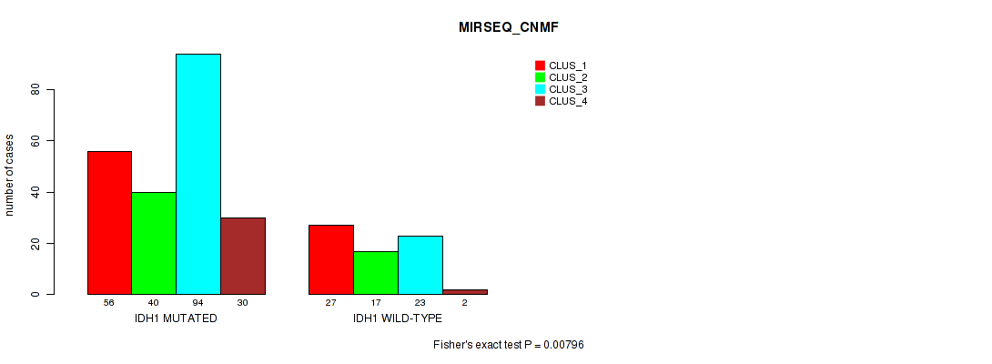 • IDH1 mutation correlated to 'CN_CNMF',  'METHLYATION_CNMF',  'RPPA_CNMF',  'MRNASEQ_CNMF',  'MRNASEQ_CHIERARCHICAL',  'MIRSEQ_CHIERARCHICAL',  'MIRSEQ_MATURE_CNMF', and 'MIRSEQ_MATURE_CHIERARCHICAL'.