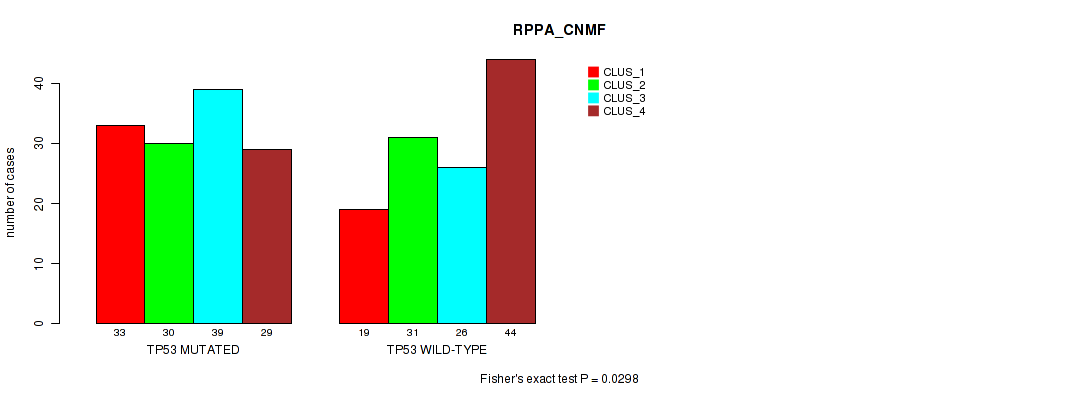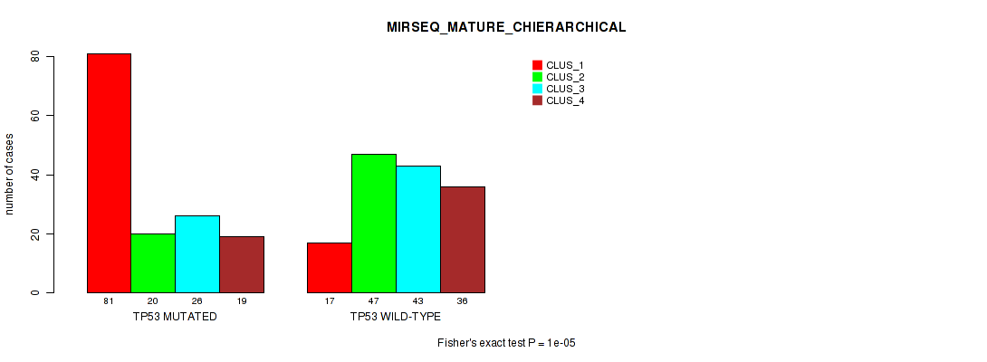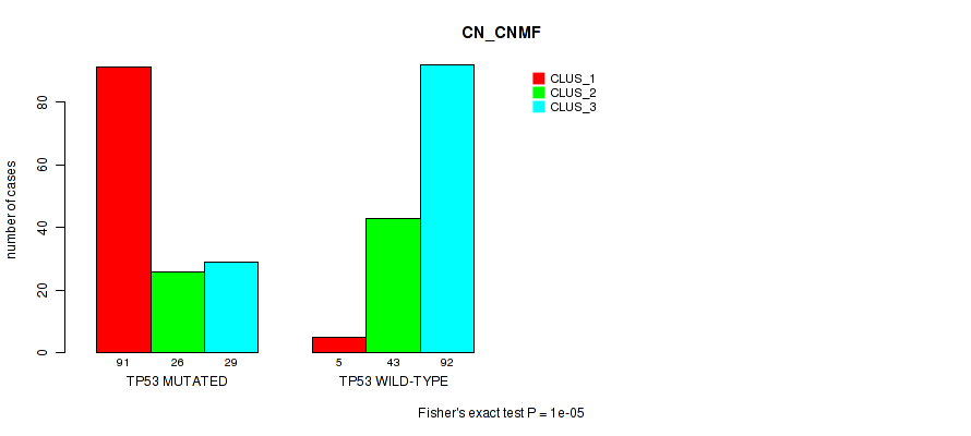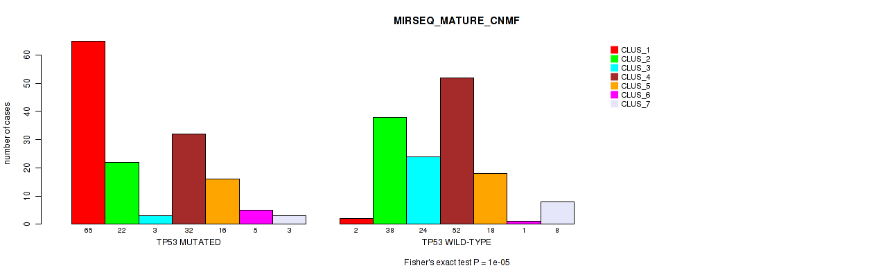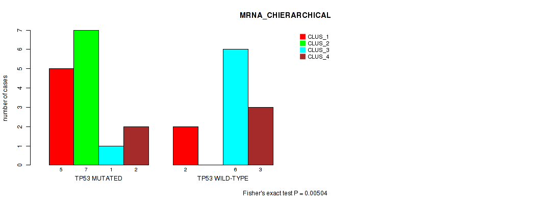 • TP53 mutation correlated to 'CN_CNMF',  'METHLYATION_CNMF',  'MRNASEQ_CNMF',  'MRNASEQ_CHIERARCHICAL',  'MIRSEQ_CNMF',  'MIRSEQ_CHIERARCHICAL',  'MIRSEQ_MATURE_CNMF', and 'MIRSEQ_MATURE_CHIERARCHICAL'.