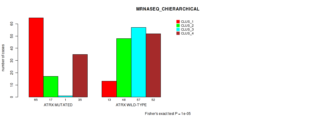 • ATRX mutation correlated to 'CN_CNMF',  'METHLYATION_CNMF',  'MRNASEQ_CNMF',  'MRNASEQ_CHIERARCHICAL',  'MIRSEQ_CHIERARCHICAL',  'MIRSEQ_MATURE_CNMF', and 'MIRSEQ_MATURE_CHIERARCHICAL'.