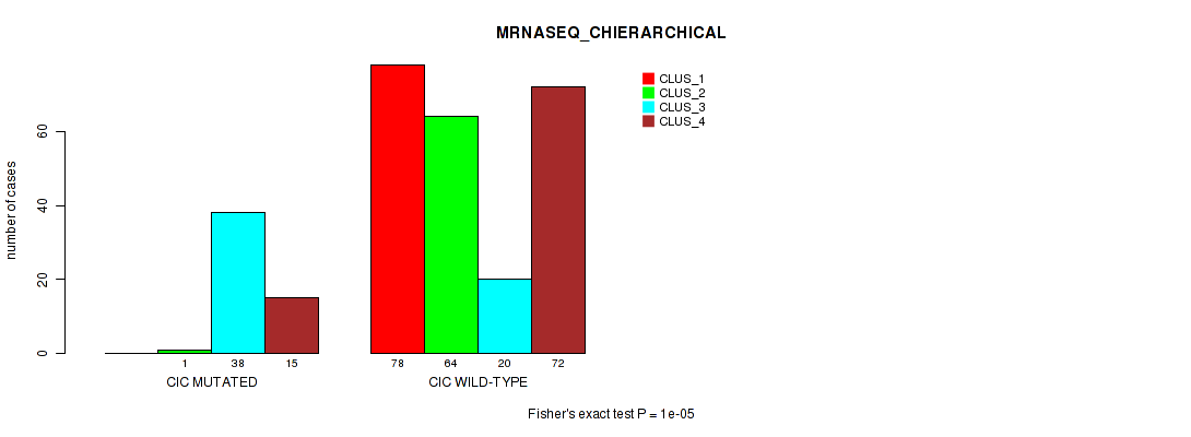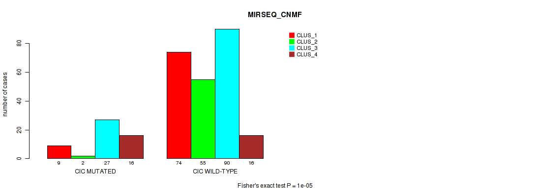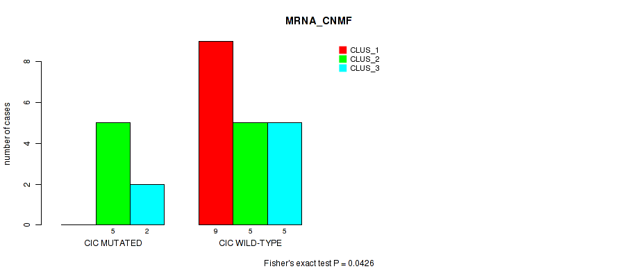 • CIC mutation correlated to 'CN_CNMF',  'METHLYATION_CNMF',  'RPPA_CNMF',  'MRNASEQ_CNMF',  'MRNASEQ_CHIERARCHICAL',  'MIRSEQ_CNMF',  'MIRSEQ_CHIERARCHICAL',  'MIRSEQ_MATURE_CNMF', and 'MIRSEQ_MATURE_CHIERARCHICAL'.