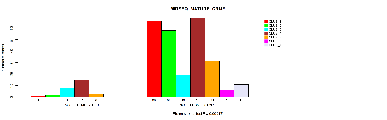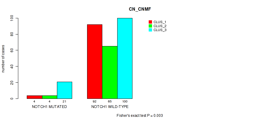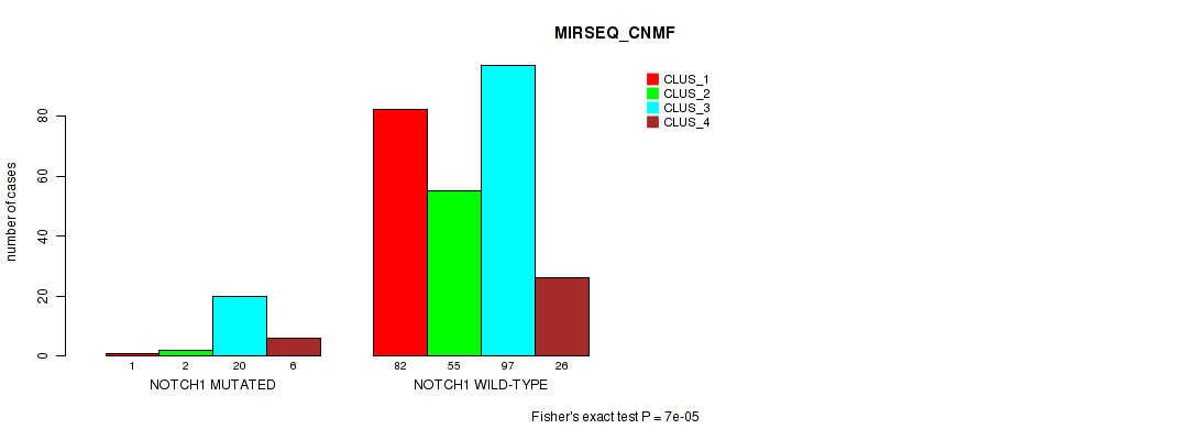 • NOTCH1 mutation correlated to 'METHLYATION_CNMF',  'MRNASEQ_CNMF',  'MRNASEQ_CHIERARCHICAL',  'MIRSEQ_CNMF',  'MIRSEQ_CHIERARCHICAL',  'MIRSEQ_MATURE_CNMF', and 'MIRSEQ_MATURE_CHIERARCHICAL'.