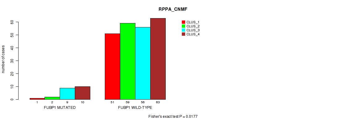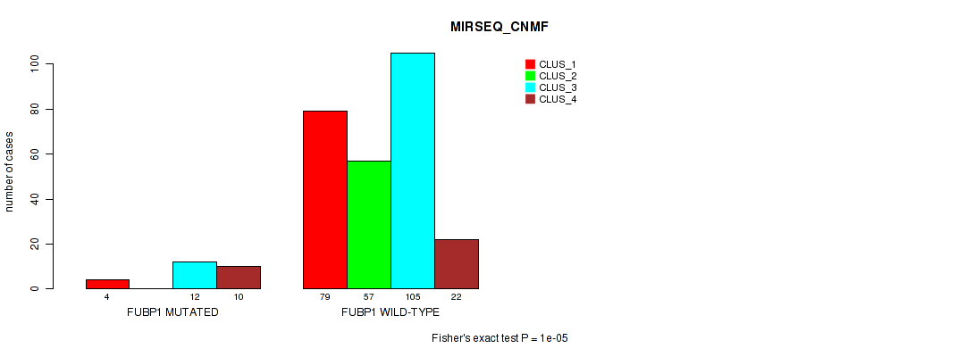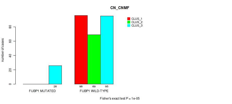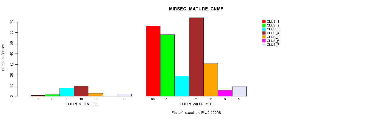 • FUBP1 mutation correlated to 'CN_CNMF',  'METHLYATION_CNMF',  'MRNASEQ_CNMF',  'MRNASEQ_CHIERARCHICAL',  'MIRSEQ_CNMF', and 'MIRSEQ_MATURE_CHIERARCHICAL'.