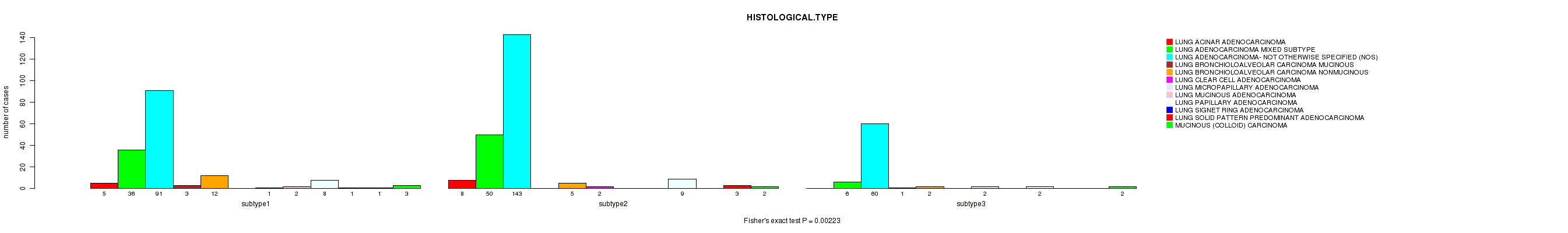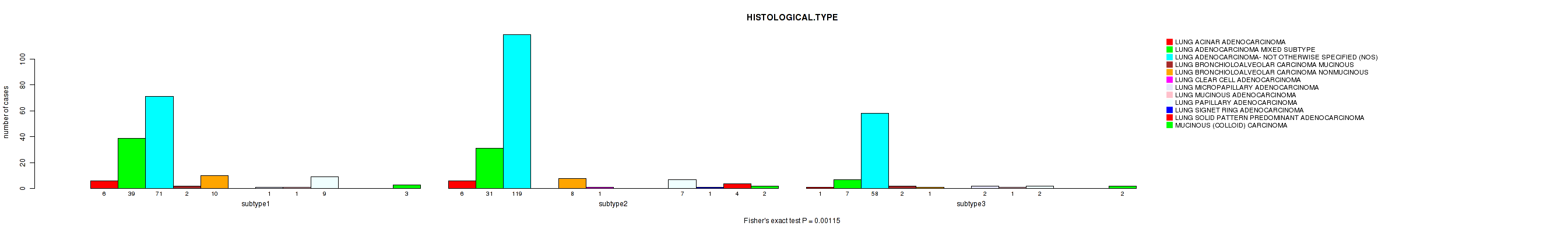 3 subtypes identified in current cancer cohort by 'MIRseq Mature CNMF subtypes'. These subtypes correlate to 'HISTOLOGICAL.TYPE'.
