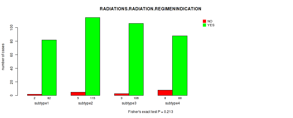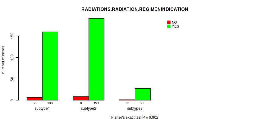 Figure S162. Get High-res Image Clustering Approach #12: 'MIRseq Mature cHierClus subtypes' versus Clinical Feature #10: 'RADIATIONS.RADIATION.REGIMENINDICATION'