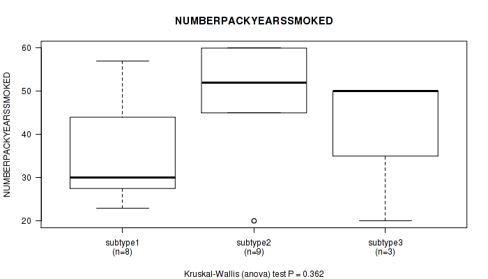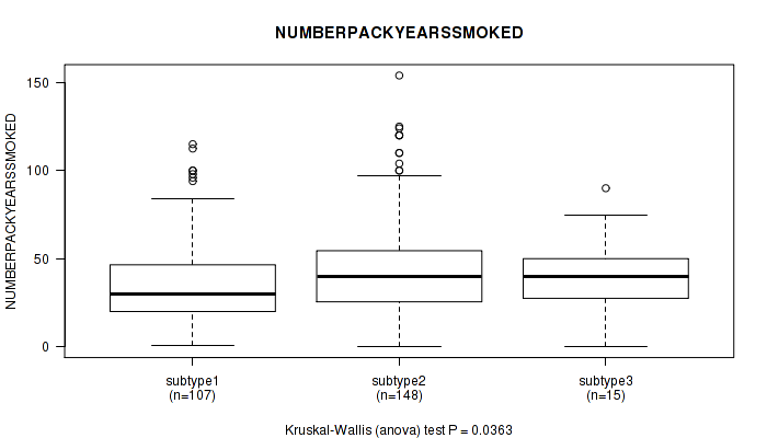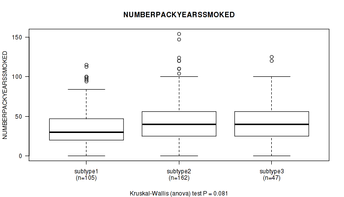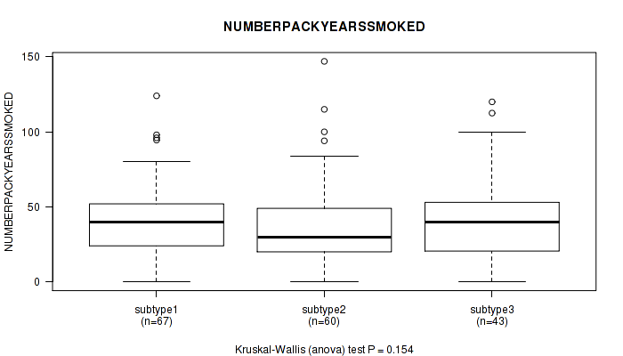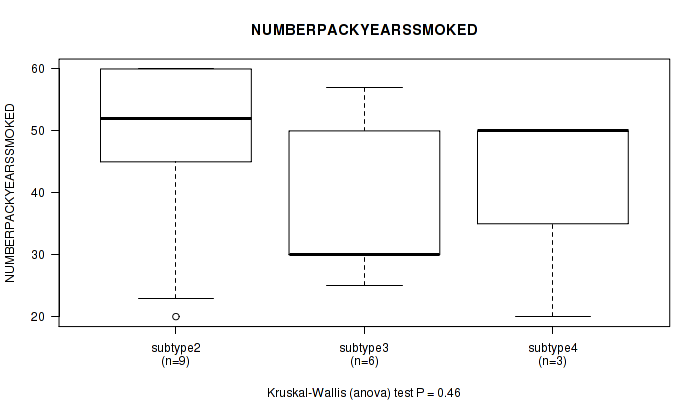 Figure S163. Get High-res Image Clustering Approach #12: 'MIRseq Mature cHierClus subtypes' versus Clinical Feature #11: 'NUMBERPACKYEARSSMOKED'