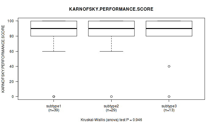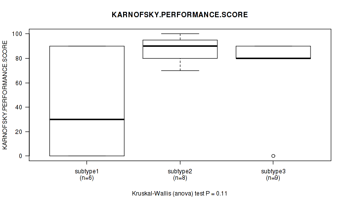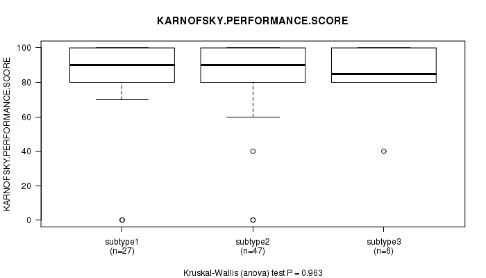 Figure S160. Get High-res Image Clustering Approach #12: 'MIRseq Mature cHierClus subtypes' versus Clinical Feature #8: 'KARNOFSKY.PERFORMANCE.SCORE'
