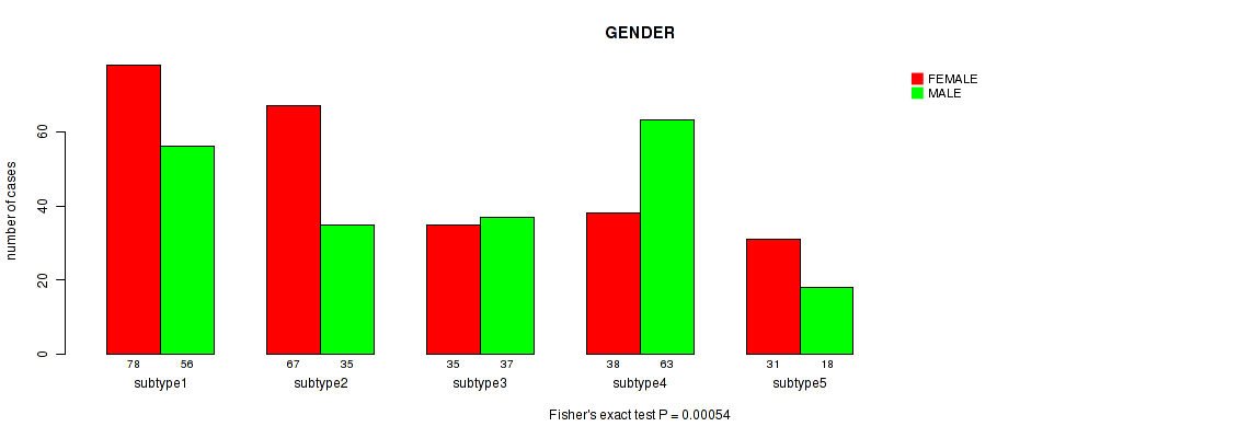CNMF clustering analysis on sequencing-based mRNA expression data identified 5 subtypes that correlate to 'AGE' and 'GENDER'.