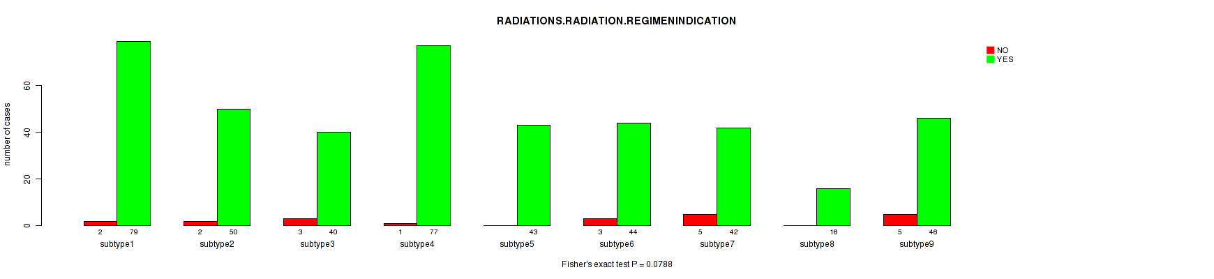 Table S174. Clustering Approach #12: 'MIRseq Mature cHierClus subtypes' versus Clinical Feature #10: 'RADIATIONS.RADIATION.REGIMENINDICATION'