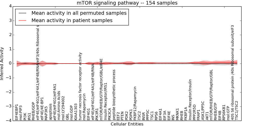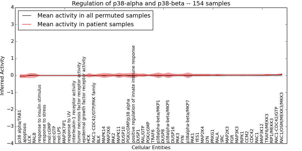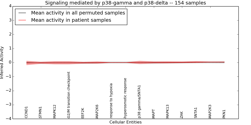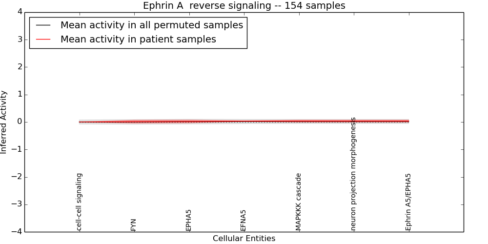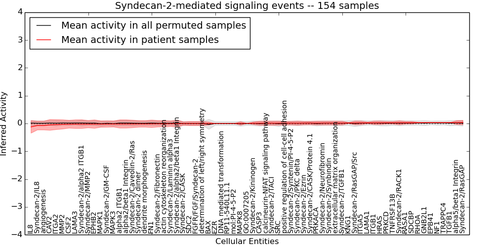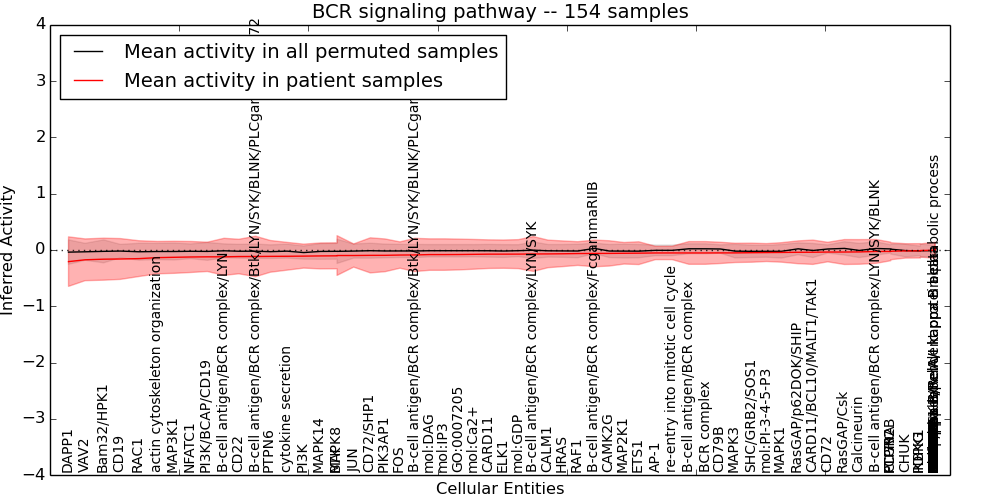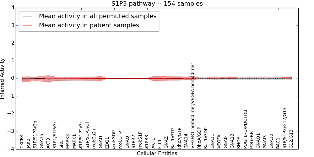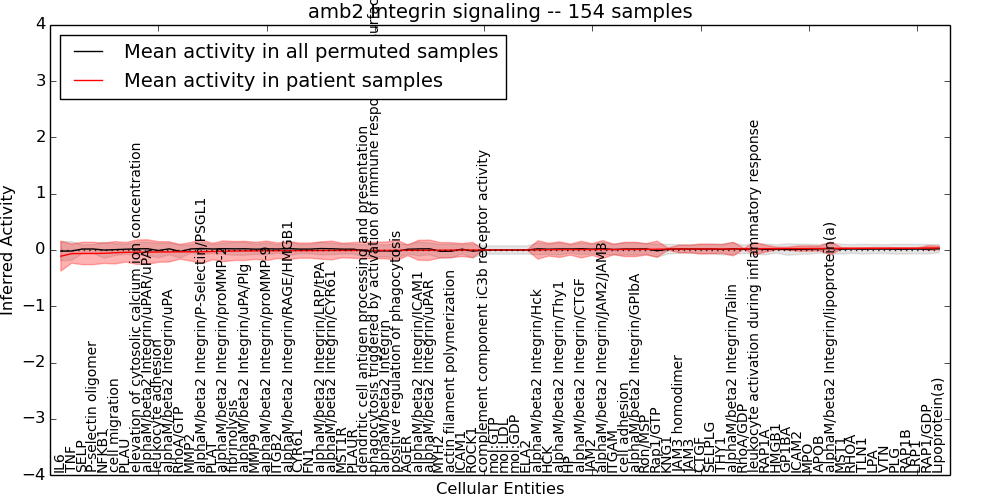 Figure S131. Get High-res Image This plot shows pathway concept perturbations across all samples against a permutation model. The concepts along the x-axis are sorted by lowest to highest mean activity for the real patient samples. Mean inferred activities are plotted along the y-axis as a colored band showing the average level and one standard deviation range. Real samples are shown in red and permuted samples in black.
