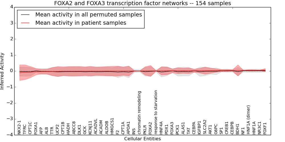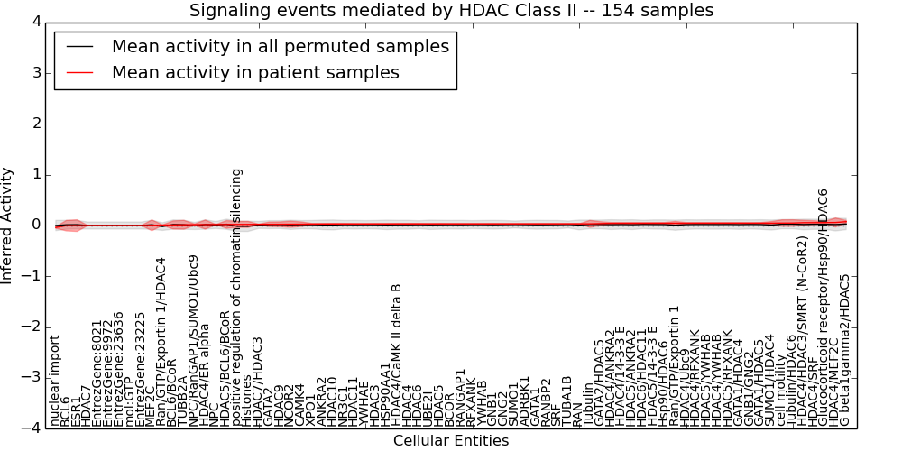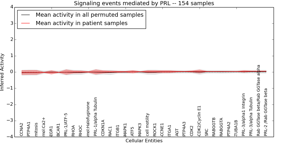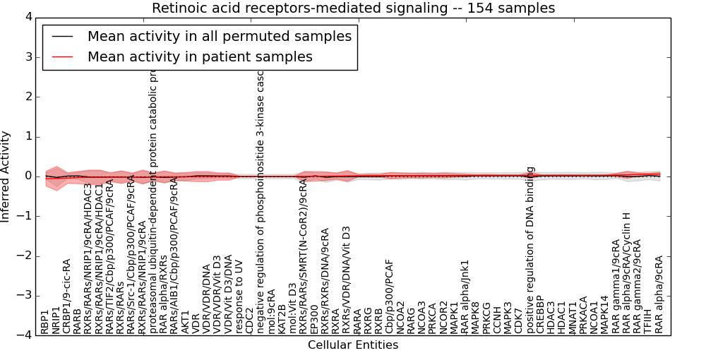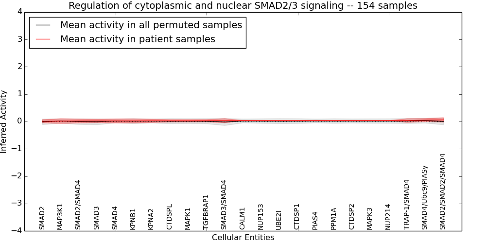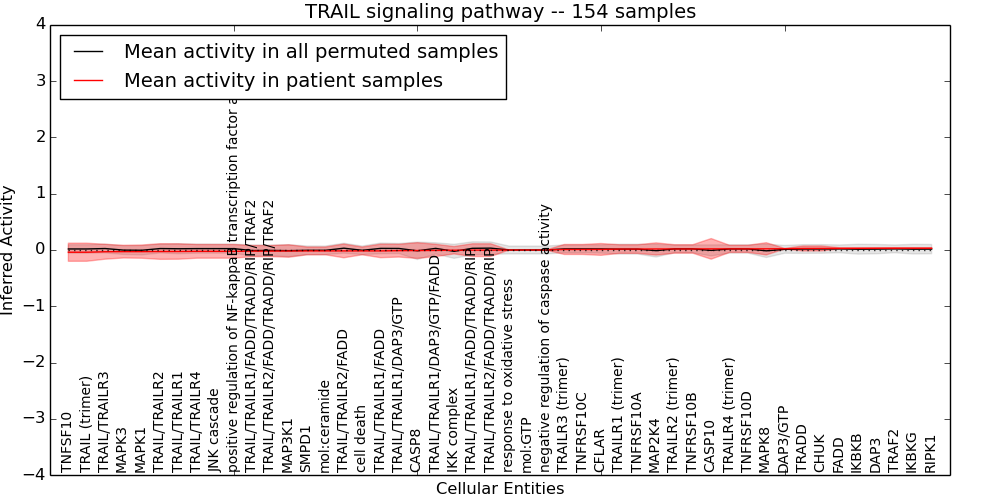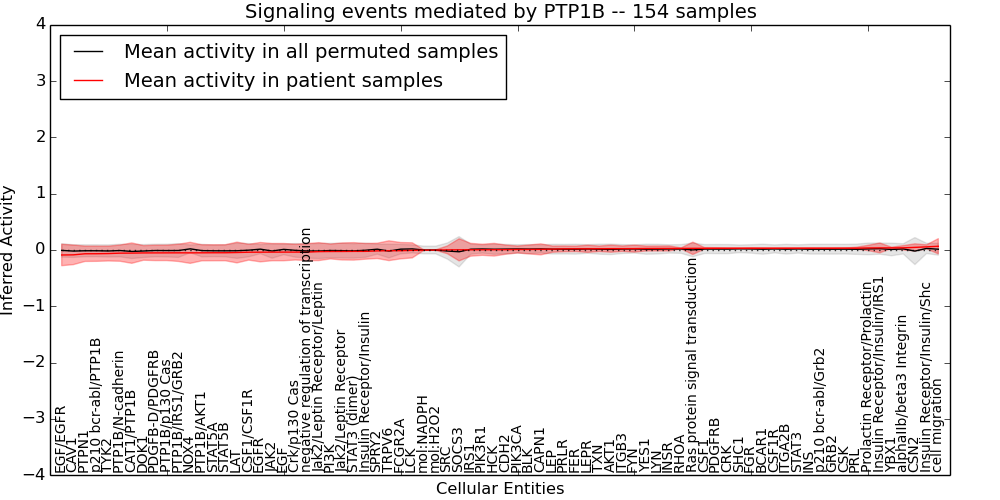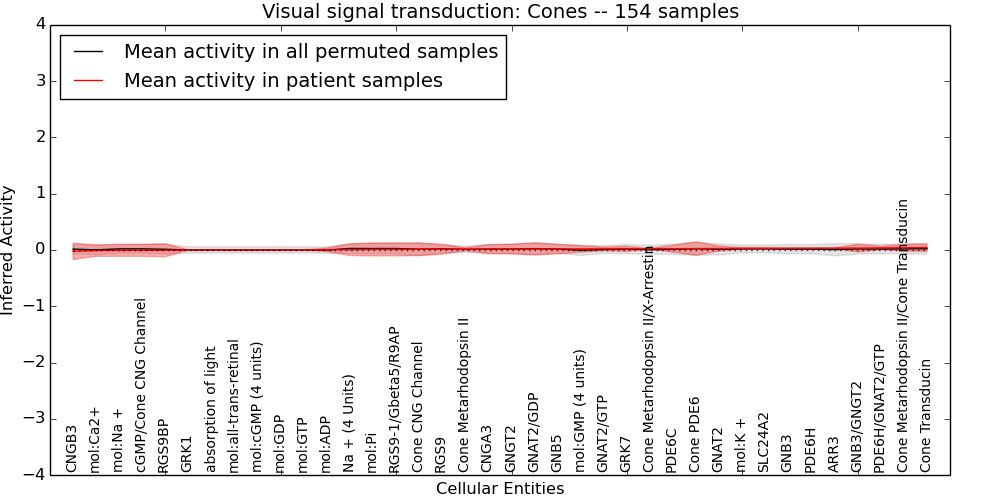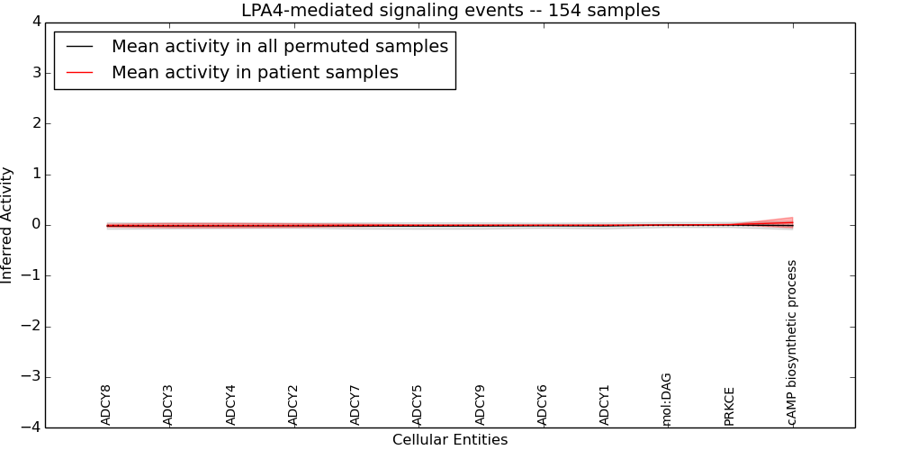Figure S131. Get High-res Image This plot shows pathway concept perturbations across all samples against a permutation model. The concepts along the x-axis are sorted by lowest to highest mean activity for the real patient samples. Mean inferred activities are plotted along the y-axis as a colored band showing the average level and one standard deviation range. Real samples are shown in red and permuted samples in black.