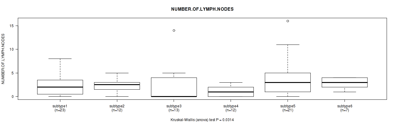 Table S103. Clustering Approach #8: 'MIRseq Mature cHierClus subtypes' versus Clinical Feature #11: 'NUMBER.OF.LYMPH.NODES'