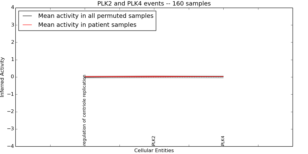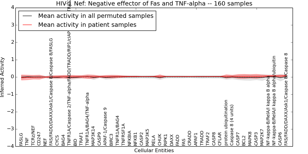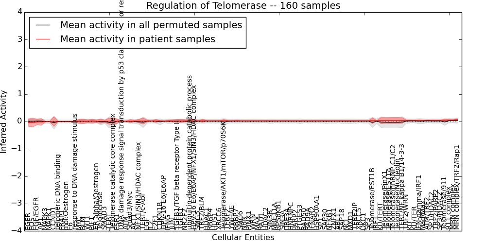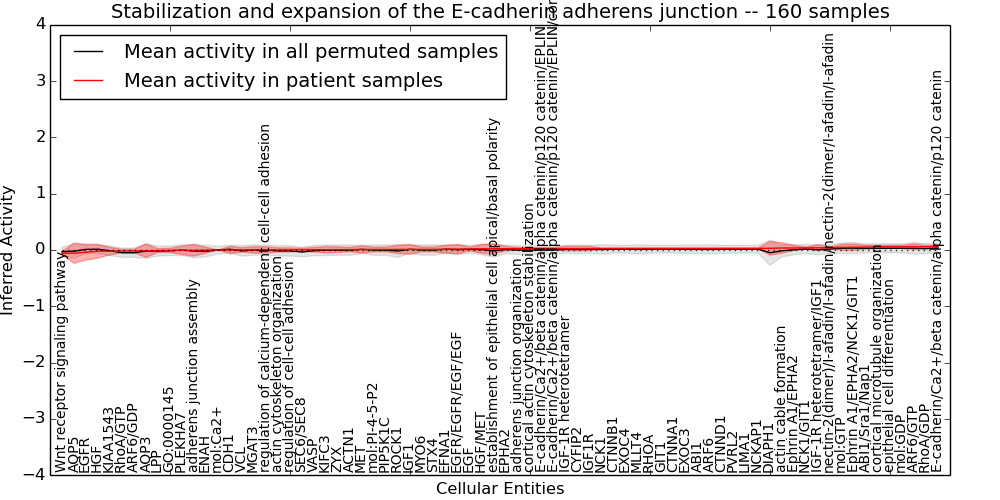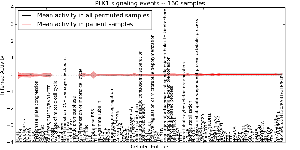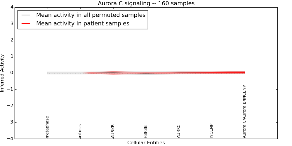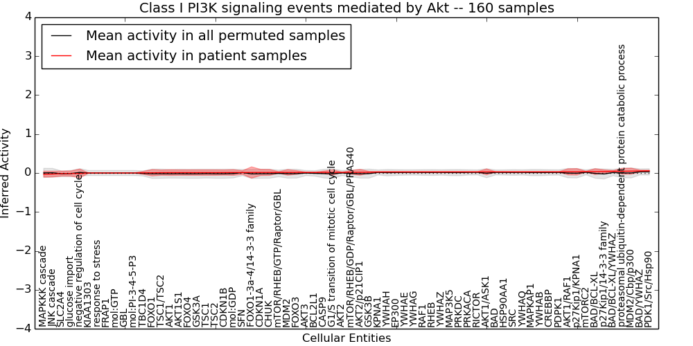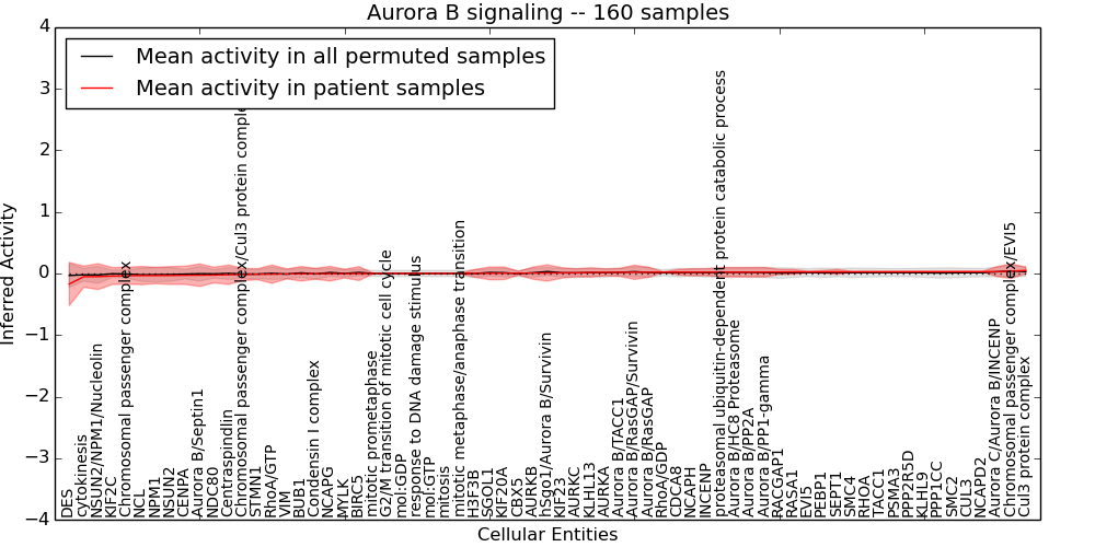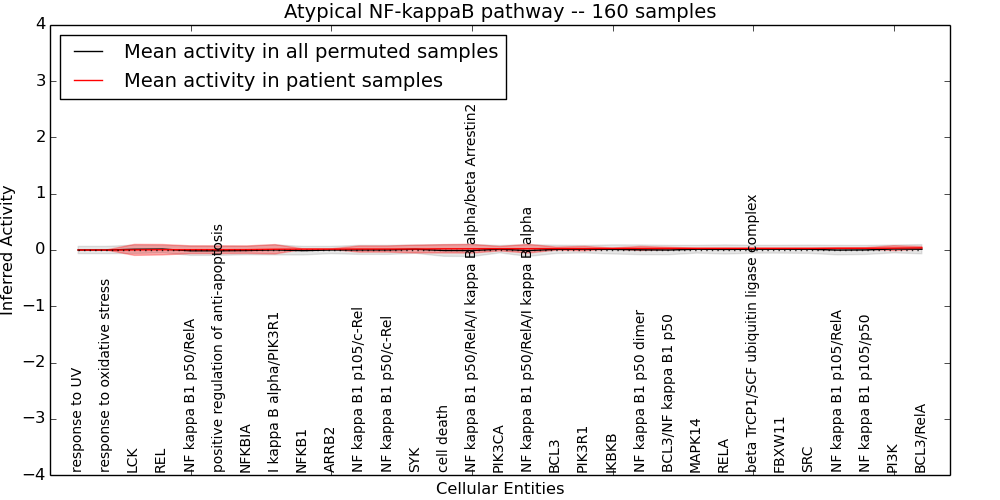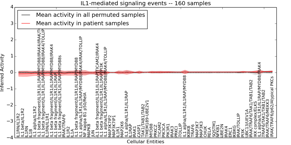 Figure S130. Get High-res Image This plot shows pathway concept perturbations across all samples against a permutation model. The concepts along the x-axis are sorted by lowest to highest mean activity for the real patient samples. Mean inferred activities are plotted along the y-axis as a colored band showing the average level and one standard deviation range. Real samples are shown in red and permuted samples in black.