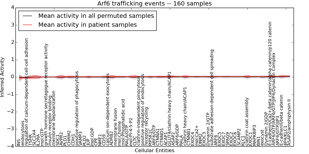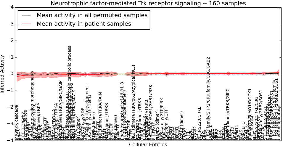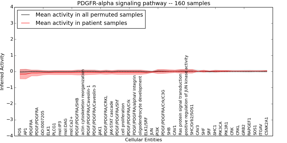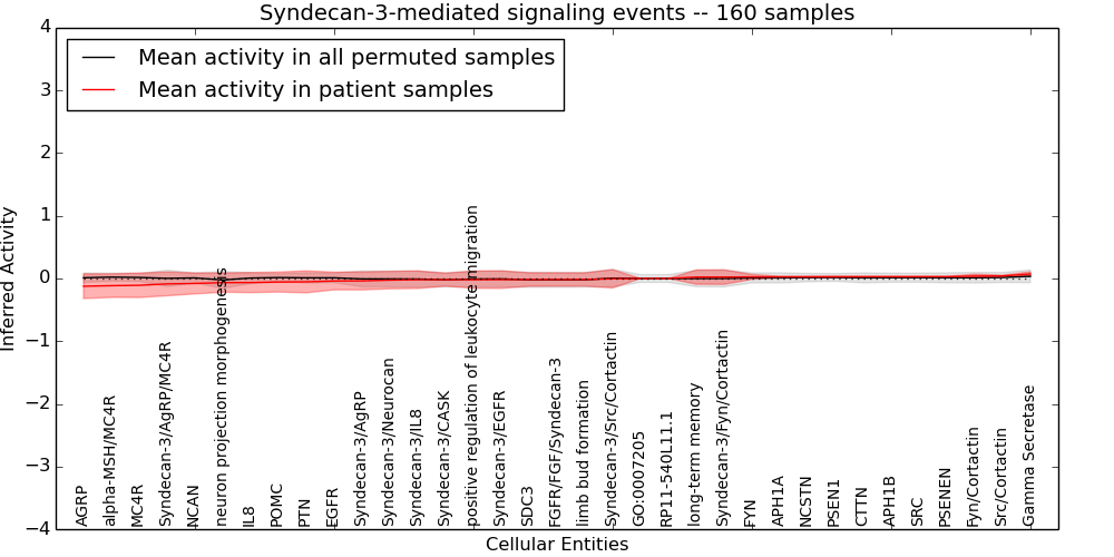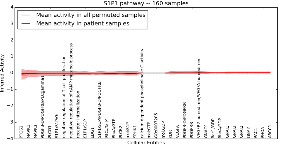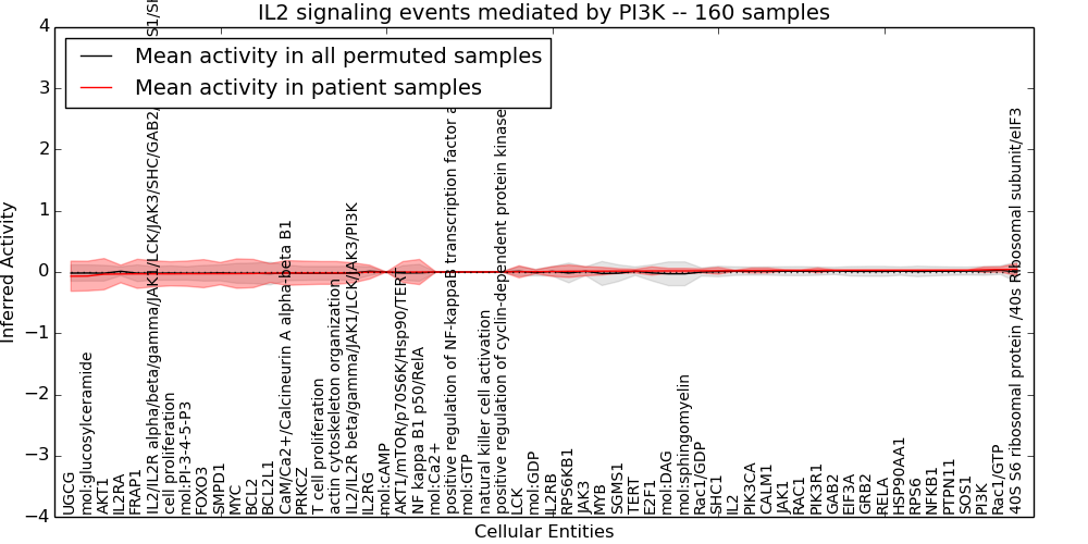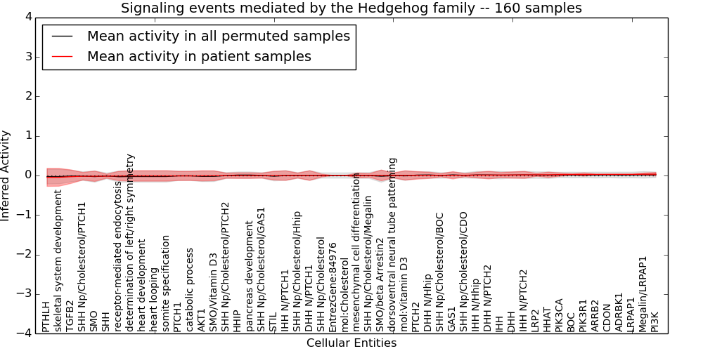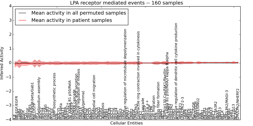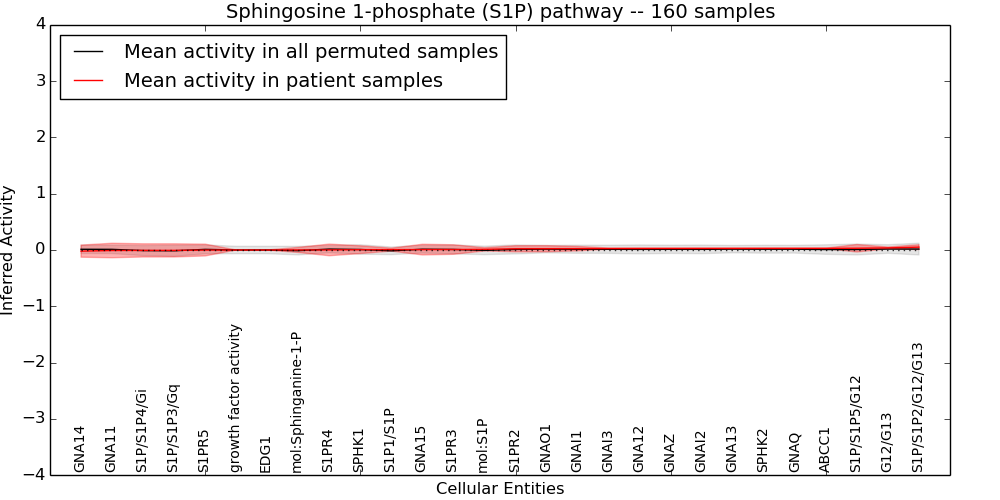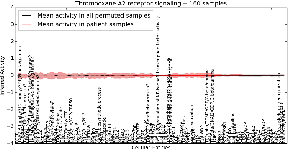 Figure S131. Get High-res Image This plot shows pathway concept perturbations across all samples against a permutation model. The concepts along the x-axis are sorted by lowest to highest mean activity for the real patient samples. Mean inferred activities are plotted along the y-axis as a colored band showing the average level and one standard deviation range. Real samples are shown in red and permuted samples in black.