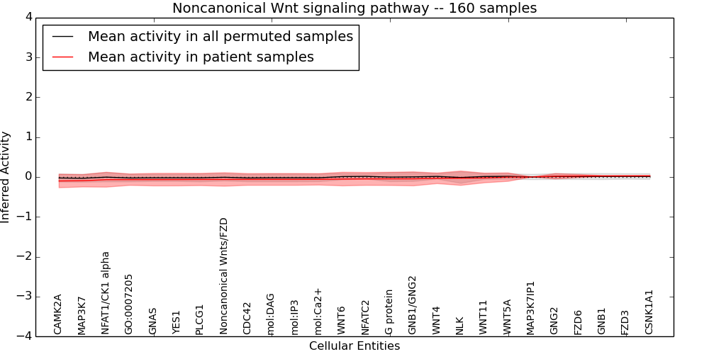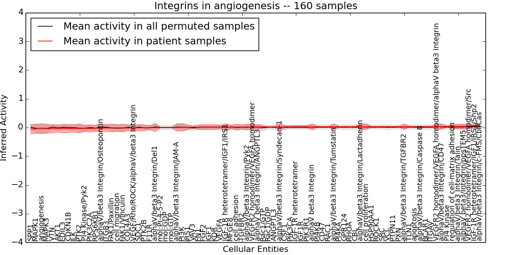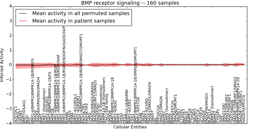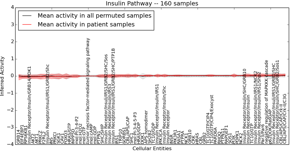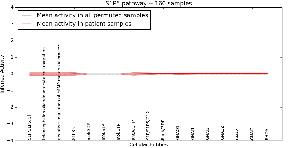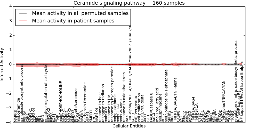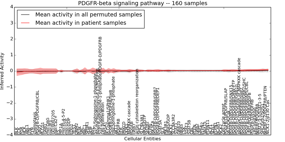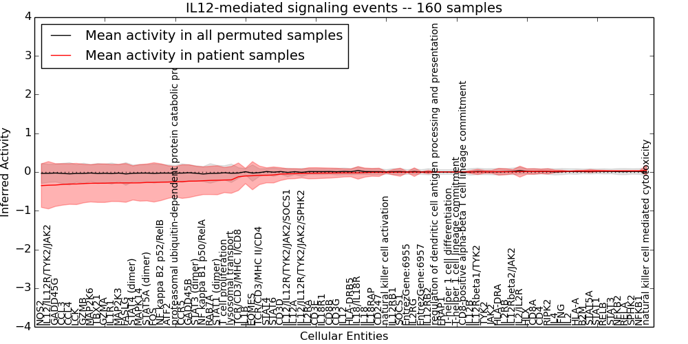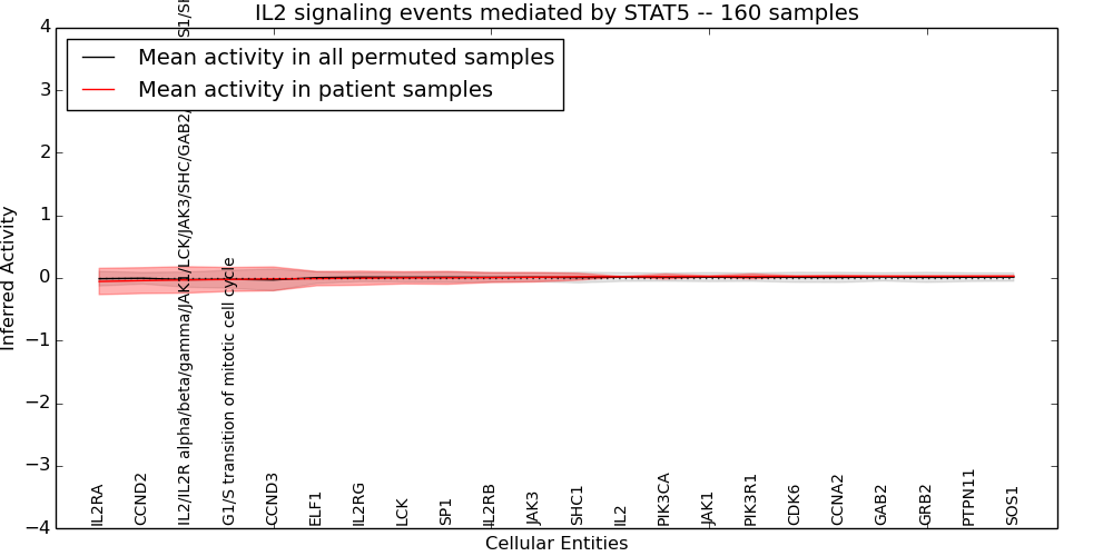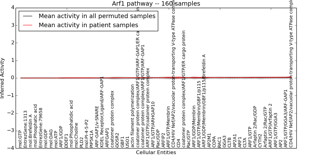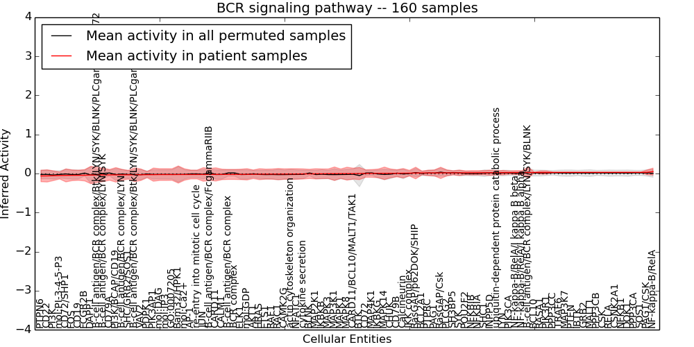 Figure S131. Get High-res Image This plot shows pathway concept perturbations across all samples against a permutation model. The concepts along the x-axis are sorted by lowest to highest mean activity for the real patient samples. Mean inferred activities are plotted along the y-axis as a colored band showing the average level and one standard deviation range. Real samples are shown in red and permuted samples in black.