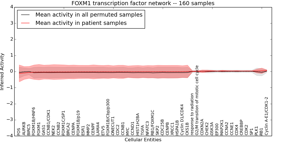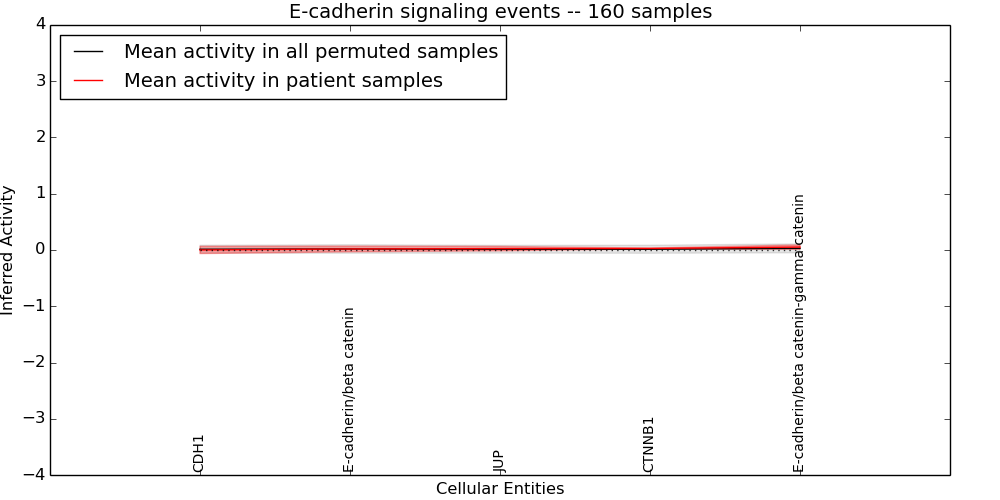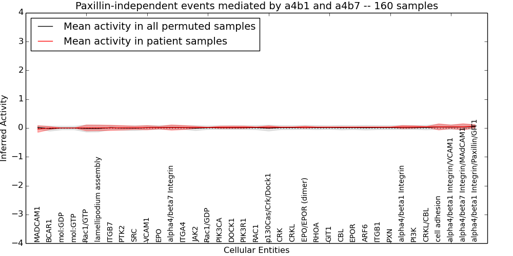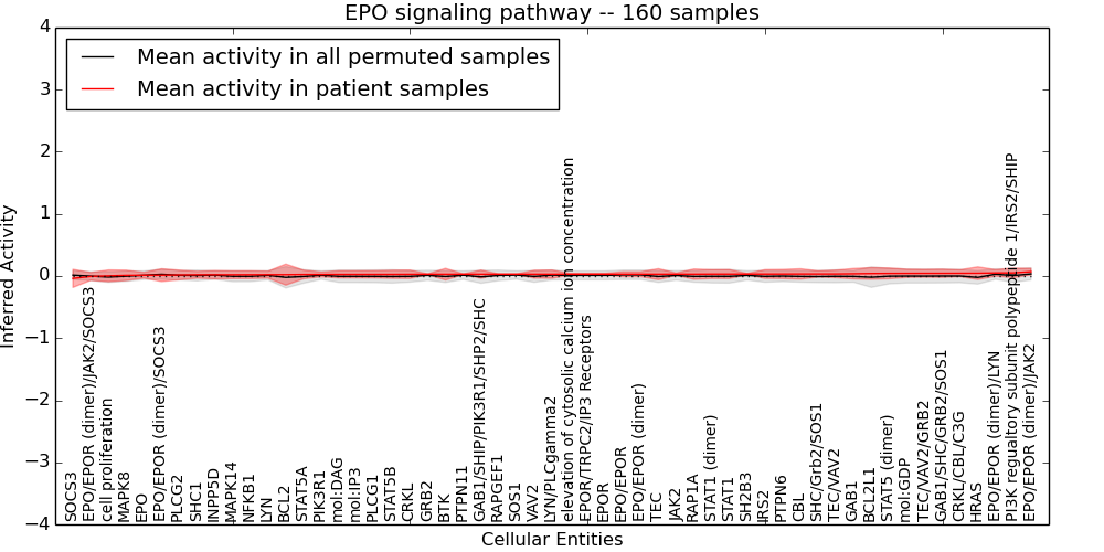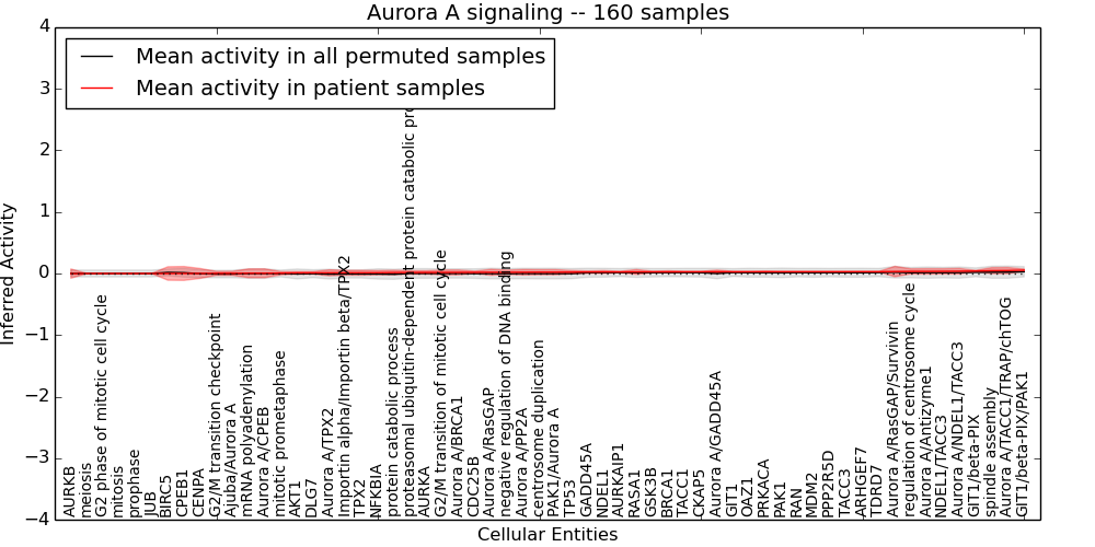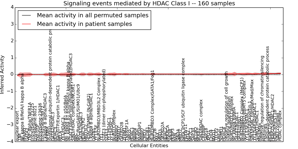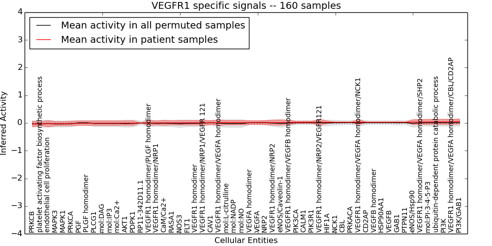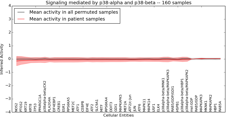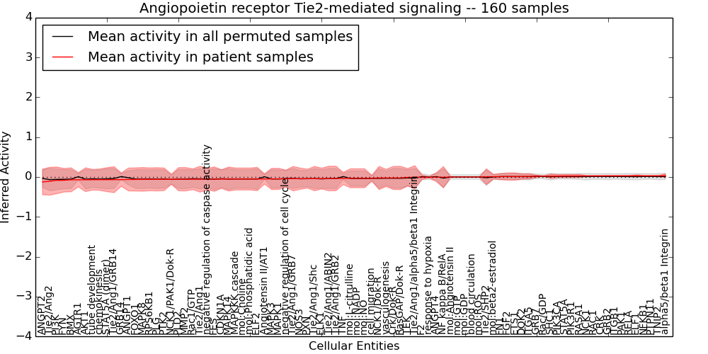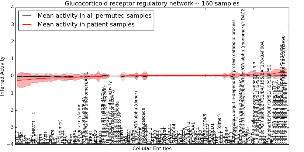 Figure S131. Get High-res Image This plot shows pathway concept perturbations across all samples against a permutation model. The concepts along the x-axis are sorted by lowest to highest mean activity for the real patient samples. Mean inferred activities are plotted along the y-axis as a colored band showing the average level and one standard deviation range. Real samples are shown in red and permuted samples in black.