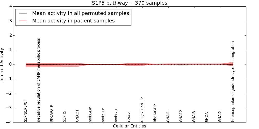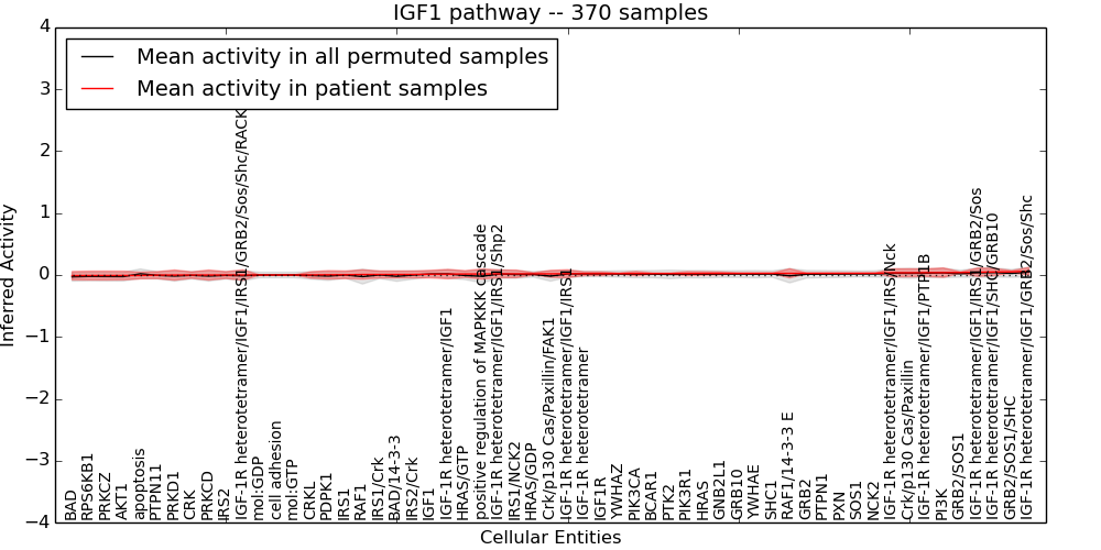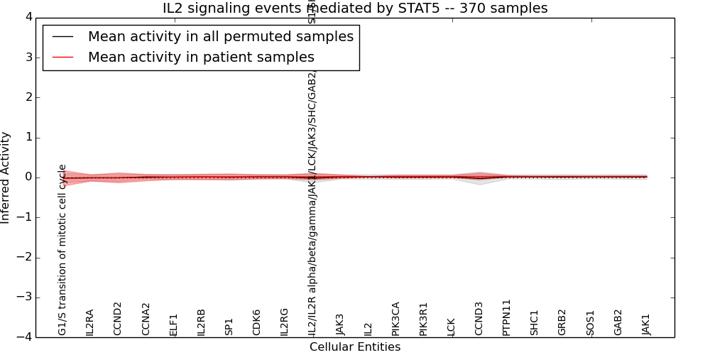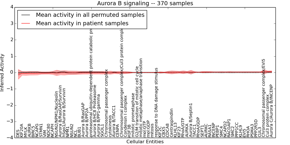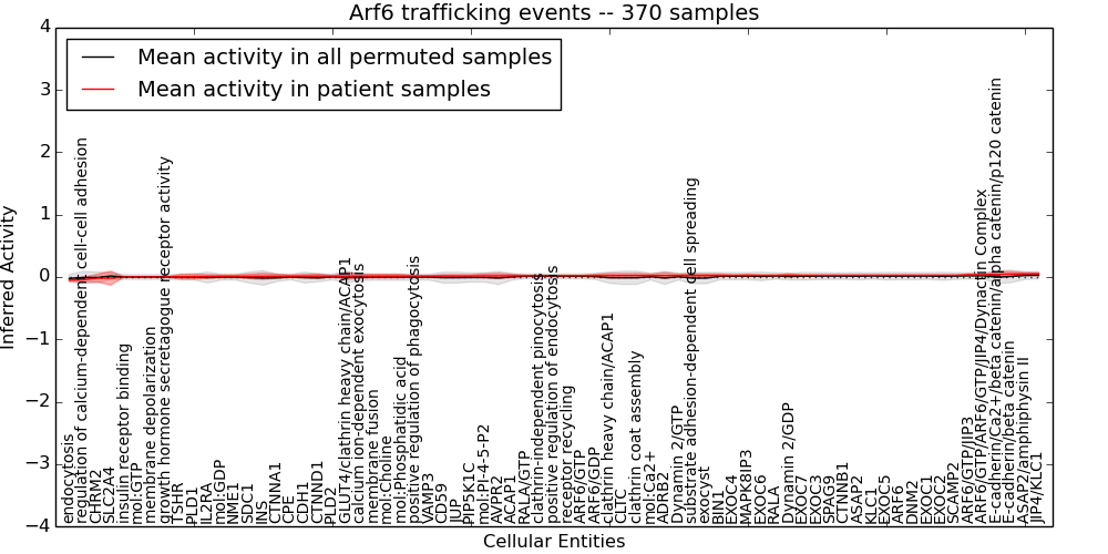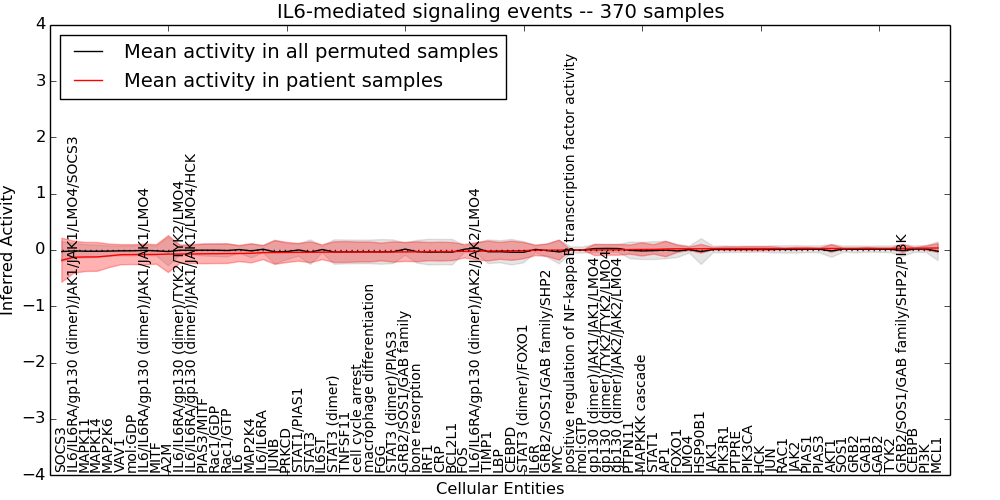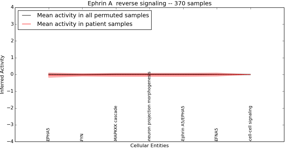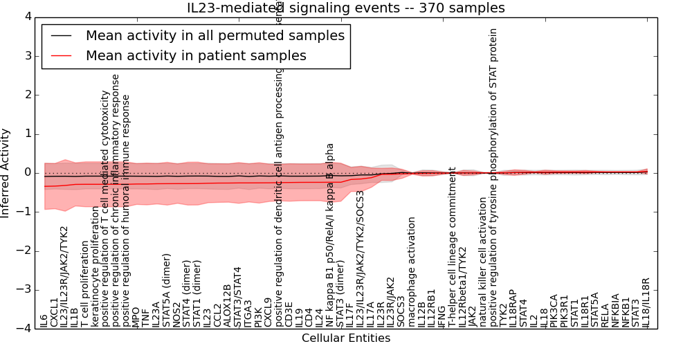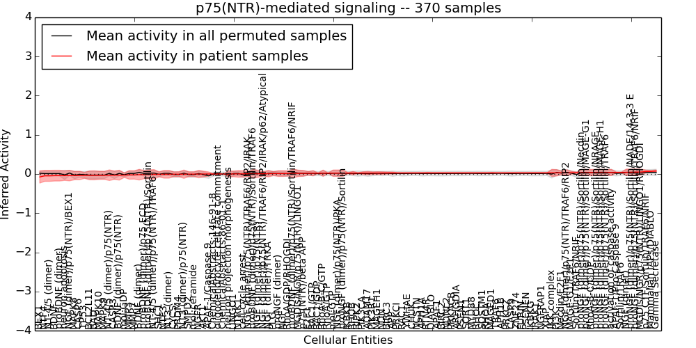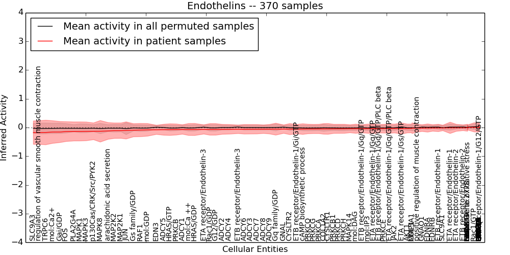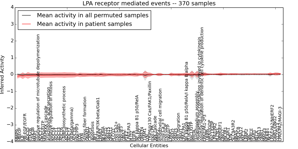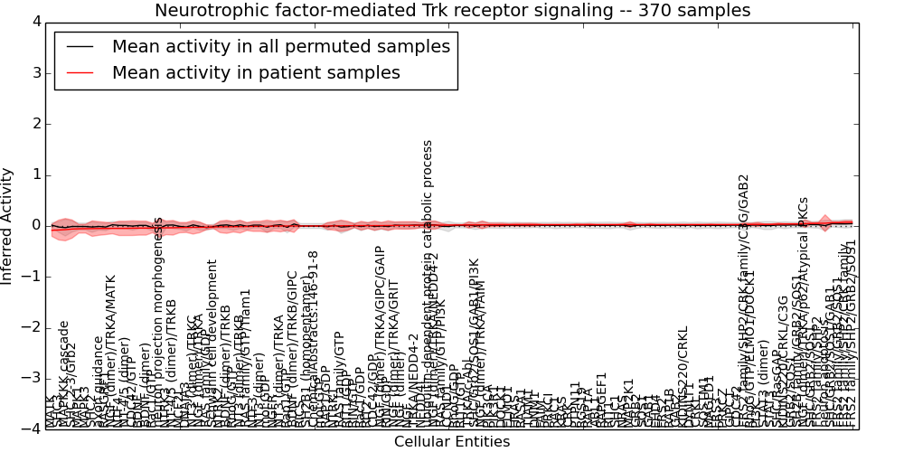 Figure S131. Get High-res Image This plot shows pathway concept perturbations across all samples against a permutation model. The concepts along the x-axis are sorted by lowest to highest mean activity for the real patient samples. Mean inferred activities are plotted along the y-axis as a colored band showing the average level and one standard deviation range. Real samples are shown in red and permuted samples in black.