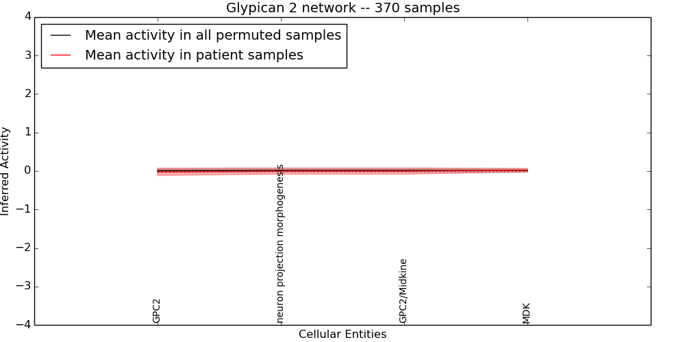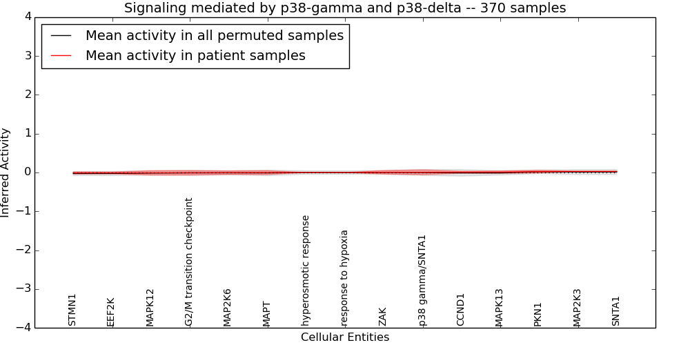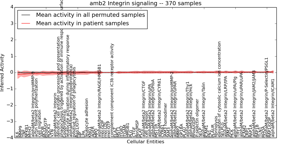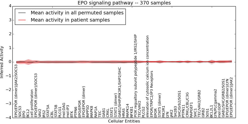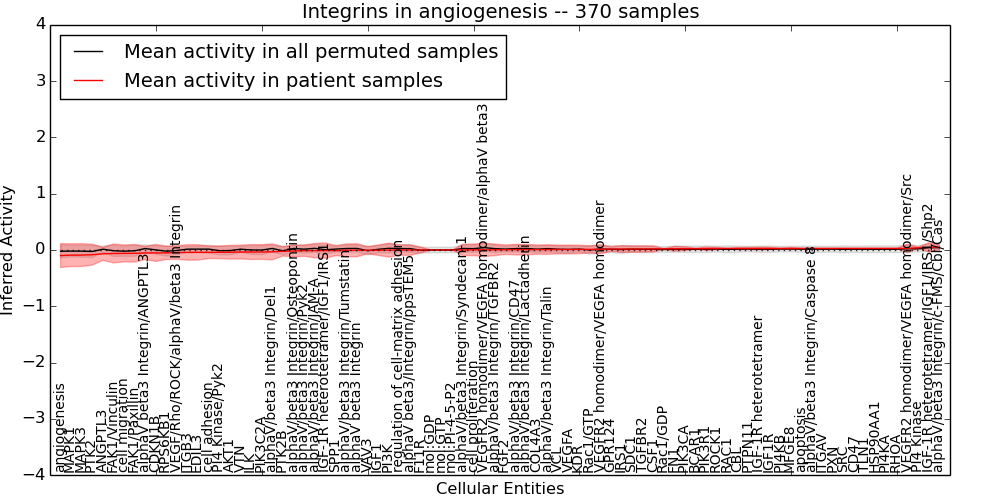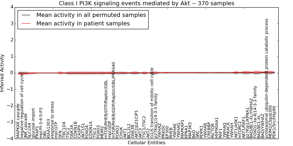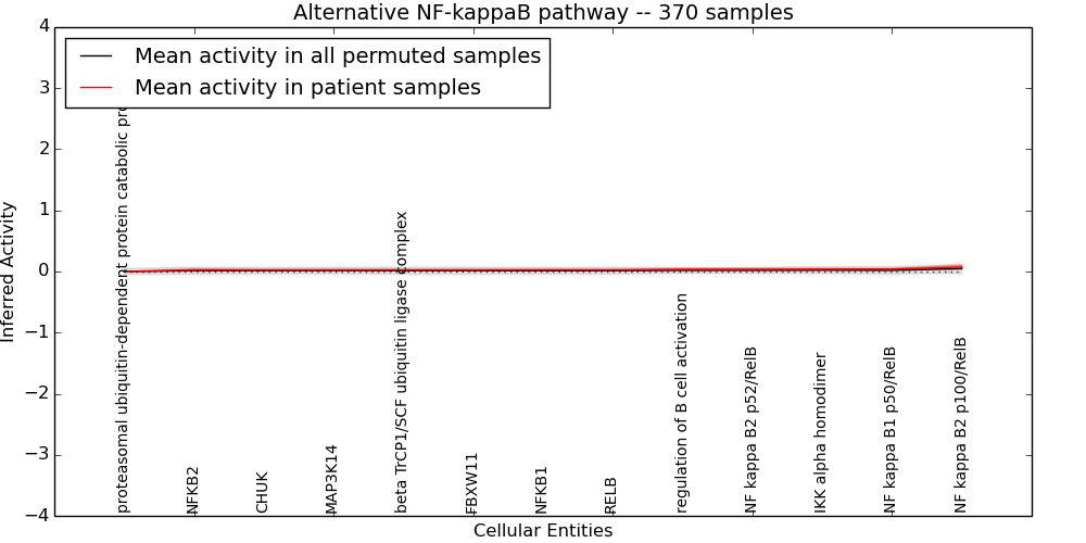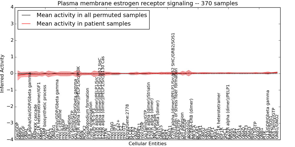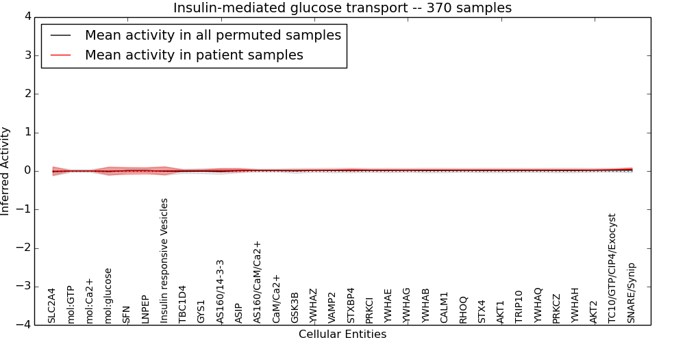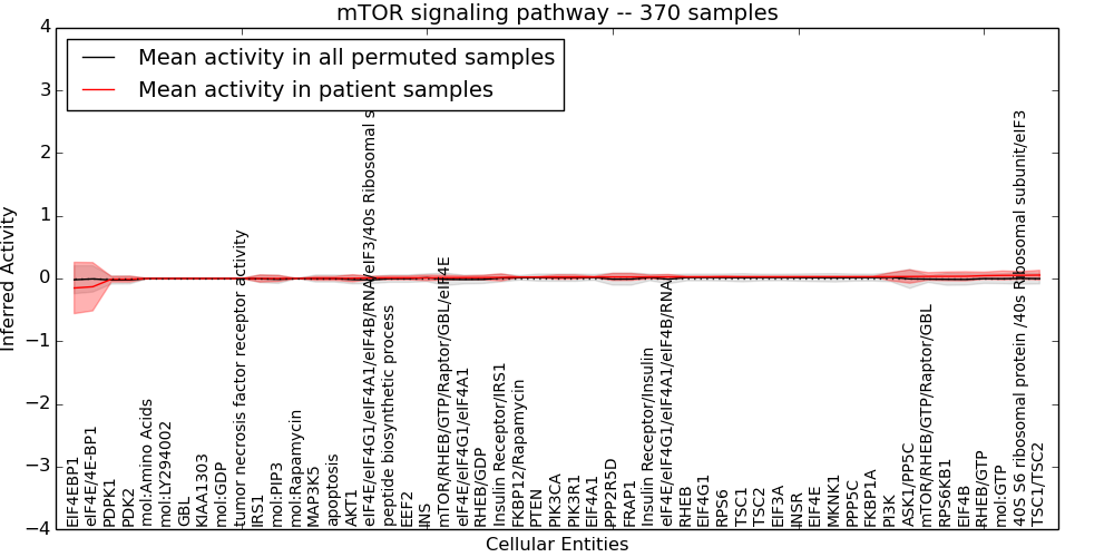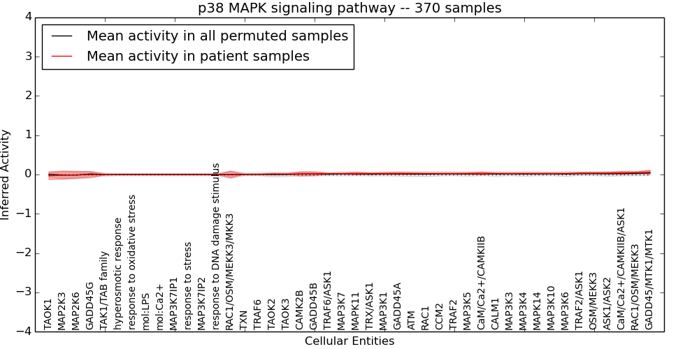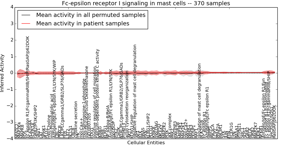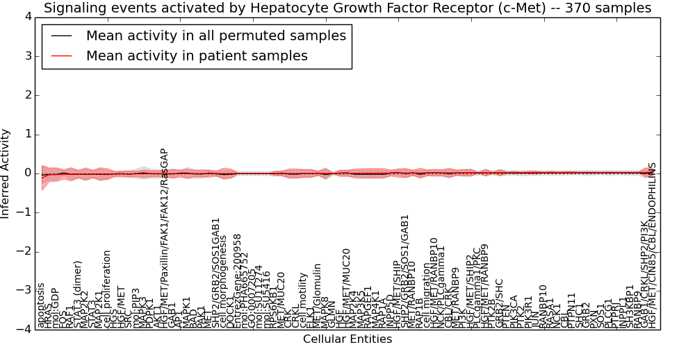 Figure S131. Get High-res Image This plot shows pathway concept perturbations across all samples against a permutation model. The concepts along the x-axis are sorted by lowest to highest mean activity for the real patient samples. Mean inferred activities are plotted along the y-axis as a colored band showing the average level and one standard deviation range. Real samples are shown in red and permuted samples in black.