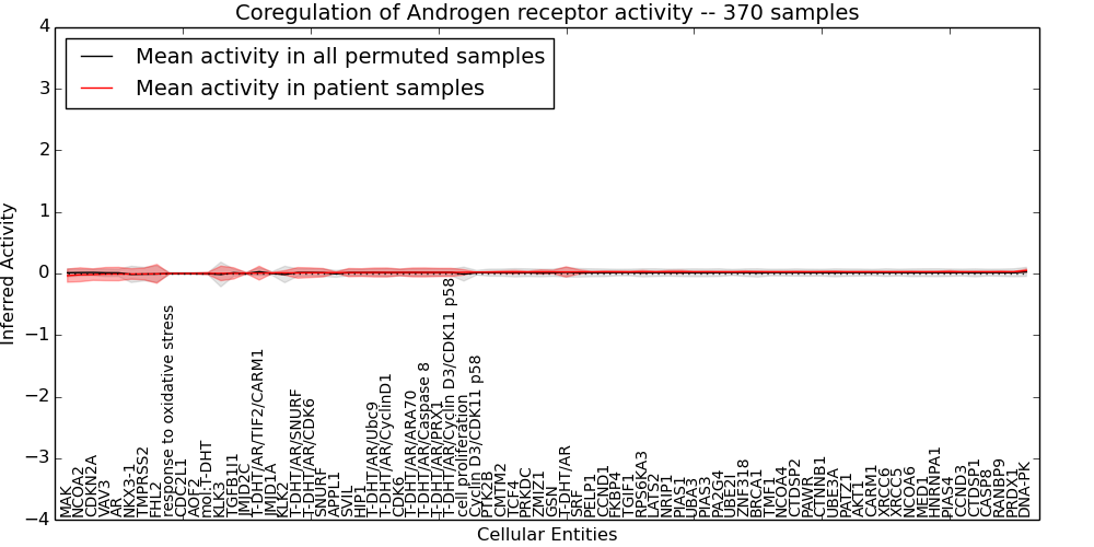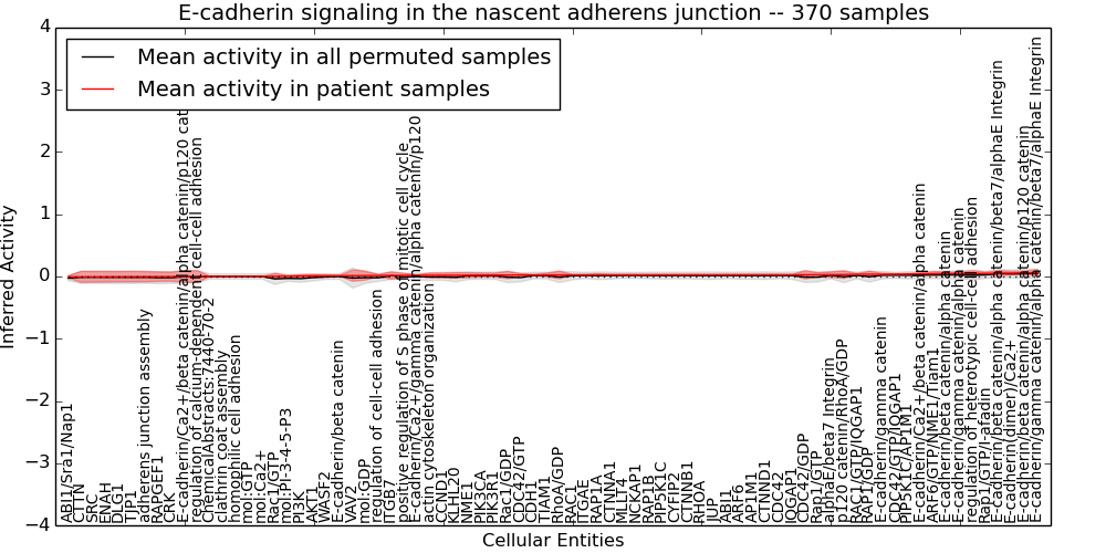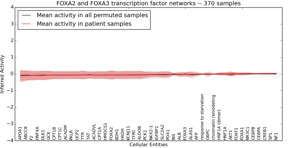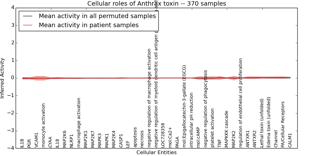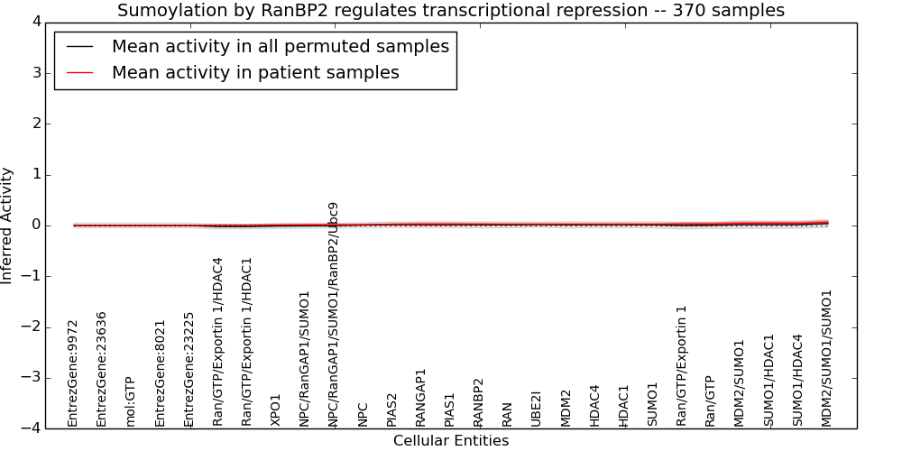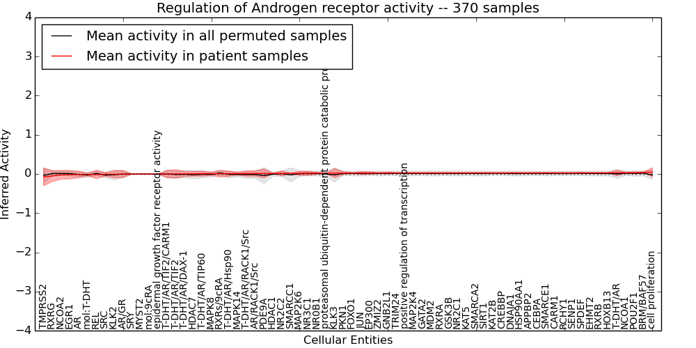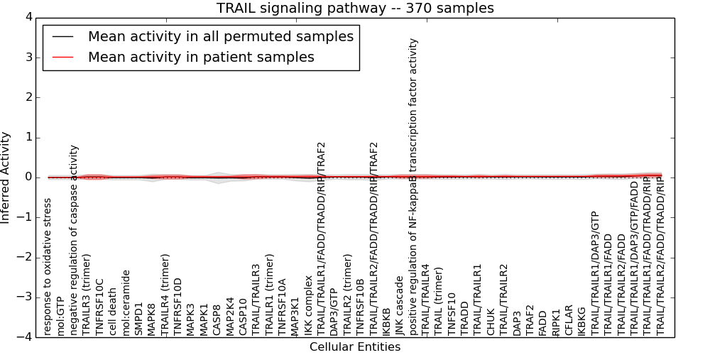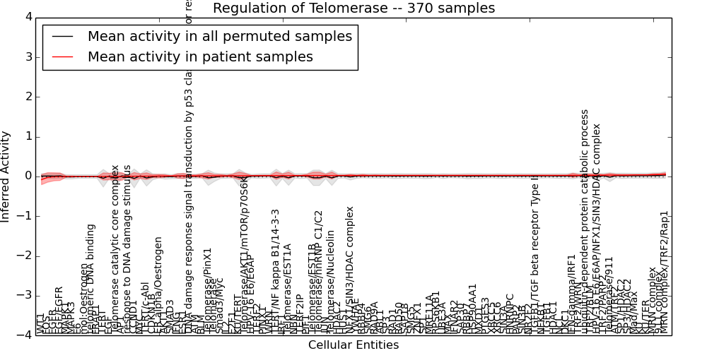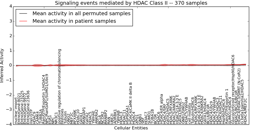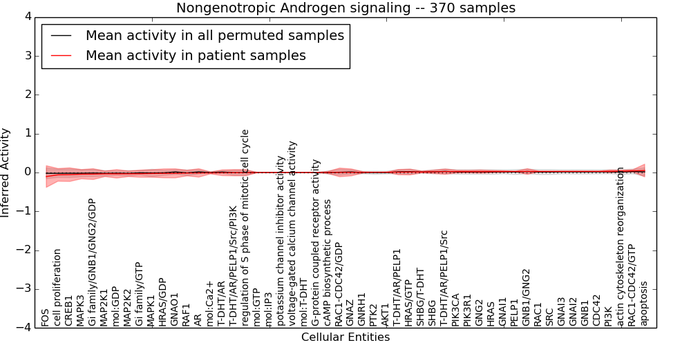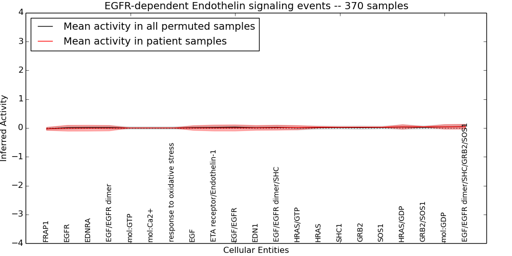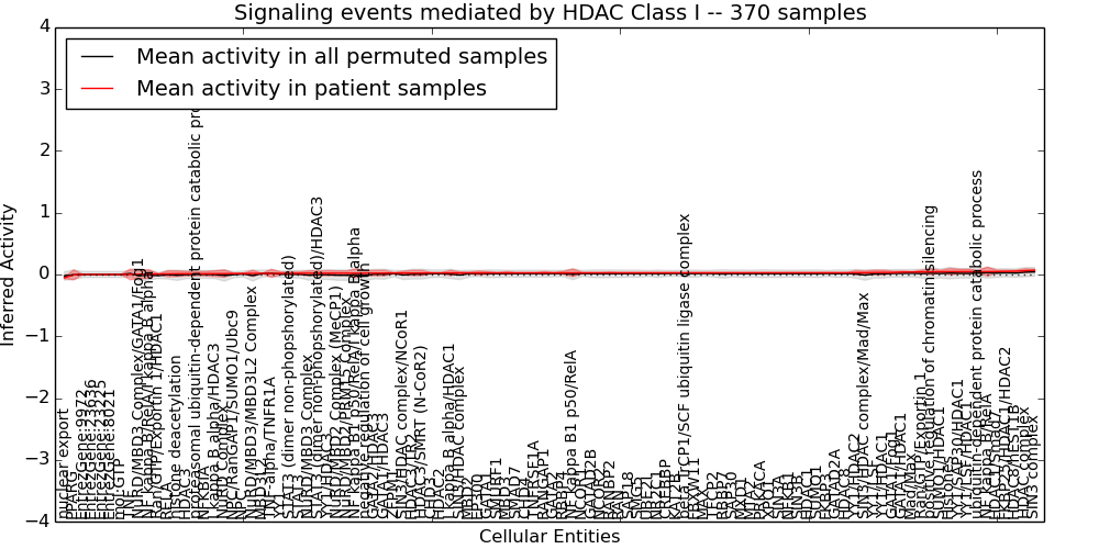 Figure S131. Get High-res Image This plot shows pathway concept perturbations across all samples against a permutation model. The concepts along the x-axis are sorted by lowest to highest mean activity for the real patient samples. Mean inferred activities are plotted along the y-axis as a colored band showing the average level and one standard deviation range. Real samples are shown in red and permuted samples in black.