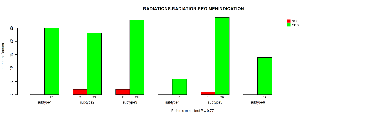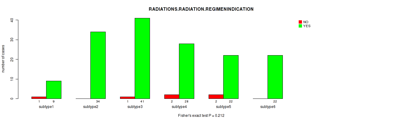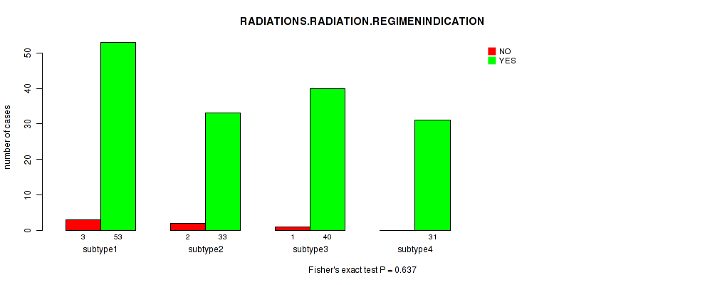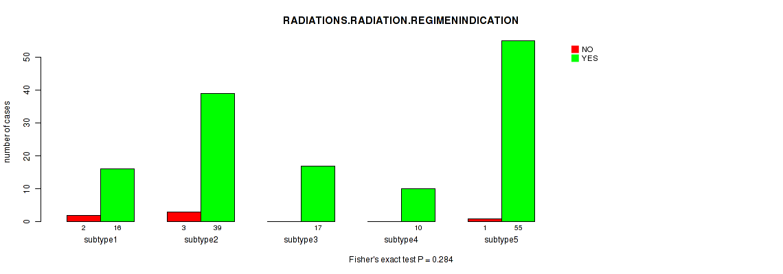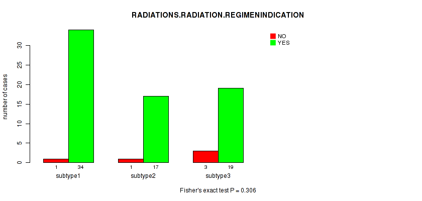 Figure S139. Get High-res Image Clustering Approach #12: 'MIRseq Mature cHierClus subtypes' versus Clinical Feature #9: 'RADIATIONS.RADIATION.REGIMENINDICATION'