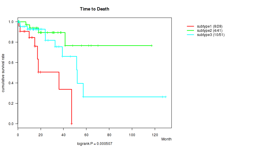CNMF clustering analysis on RPPA data identified 3 subtypes that correlate to 'Time to Death'.