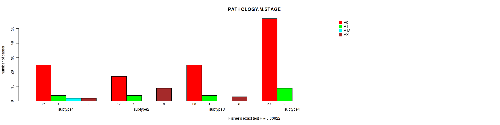 CNMF clustering analysis on sequencing-based mRNA expression data identified 4 subtypes that correlate to 'NEOPLASM.DISEASESTAGE' and 'PATHOLOGY.M.STAGE'.