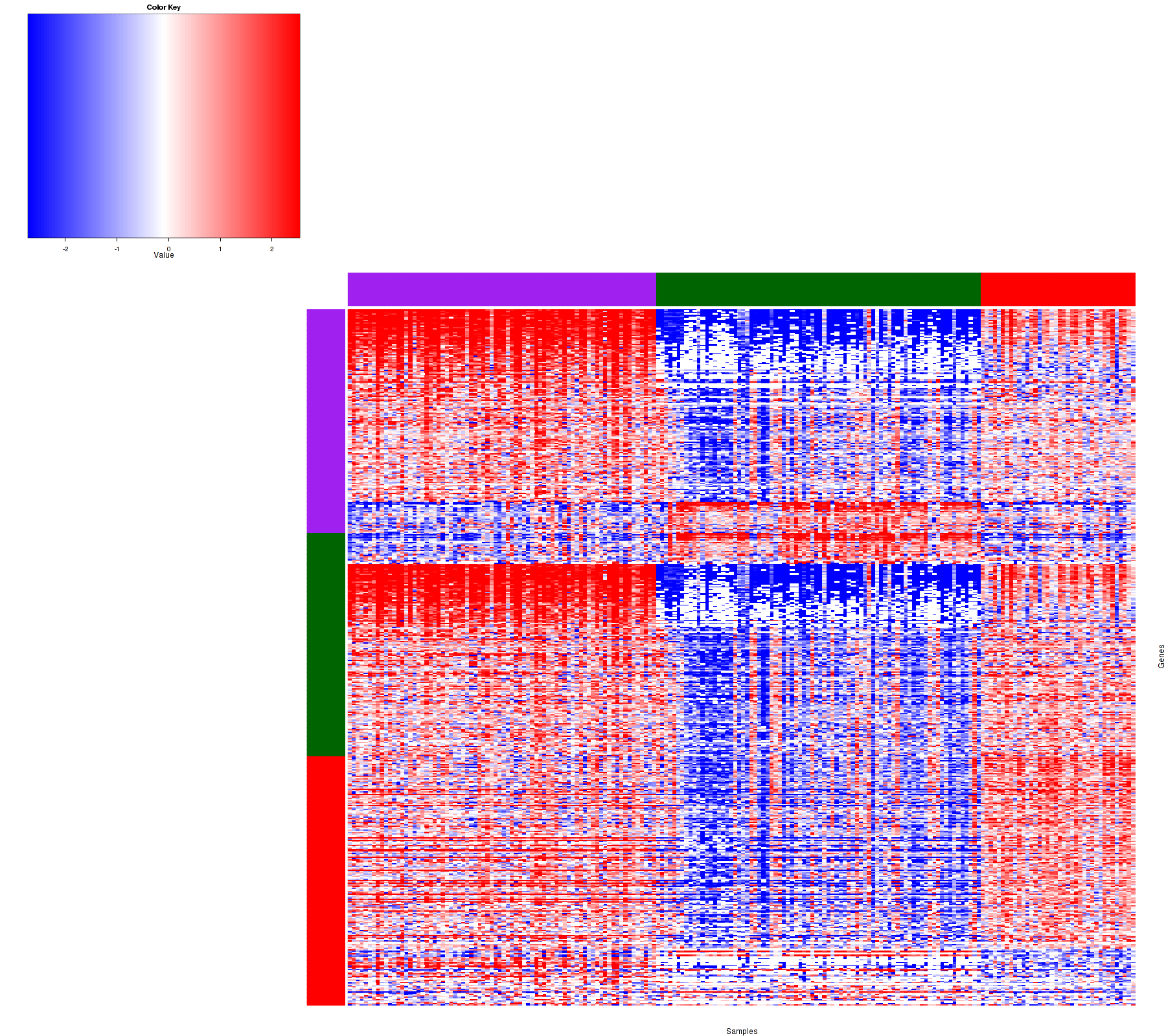 Figure 1. Get High-res Image Samples were separated into 3 clusters. Shown are 194 samples and 542 marker miRs. The color bar of the row indicates the marker miRs for the corresponding cluster.