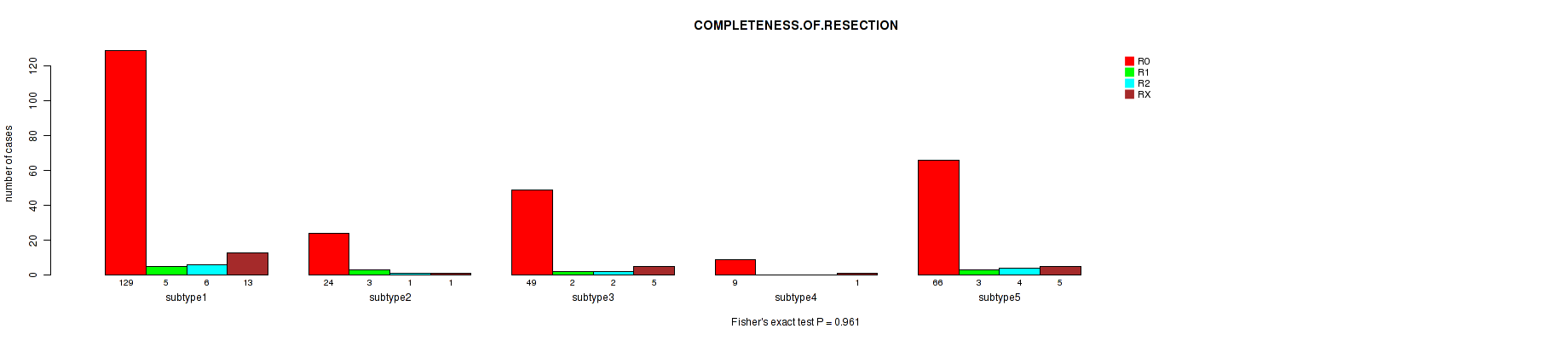 Table S128. Clustering Approach #10: 'MIRseq Mature cHierClus subtypes' versus Clinical Feature #10: 'COMPLETENESS.OF.RESECTION'