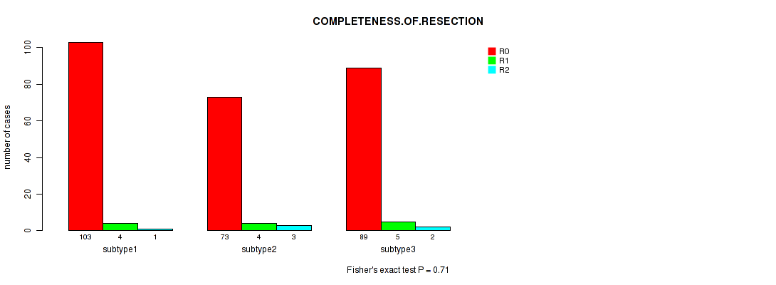 Figure S106. Get High-res Image Clustering Approach #9: 'MIRseq Mature CNMF subtypes' versus Clinical Feature #10: 'COMPLETENESS.OF.RESECTION'