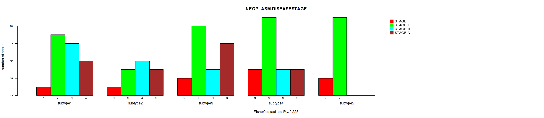 5 subtypes identified in current cancer cohort by 'MIRSEQ CHIERARCHICAL'. These subtypes correlate to 'NEOPLASM.DISEASESTAGE'.