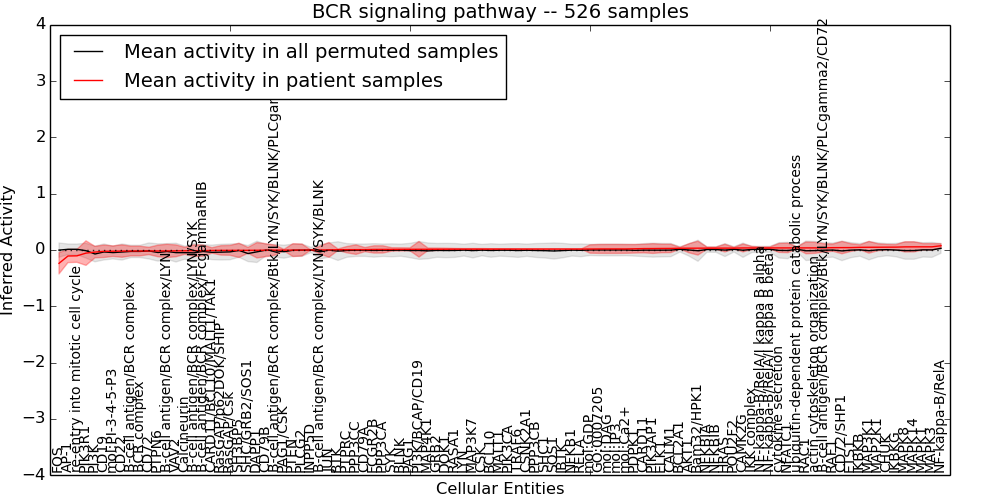 Figure S130. Get High-res Image This plot shows pathway concept perturbations across all samples against a permutation model. The concepts along the x-axis are sorted by lowest to highest mean activity for the real patient samples. Mean inferred activities are plotted along the y-axis as a colored band showing the average level and one standard deviation range. Real samples are shown in red and permuted samples in black.