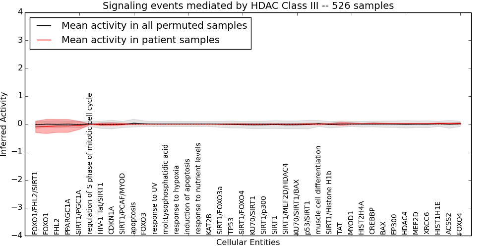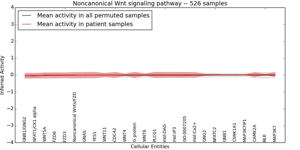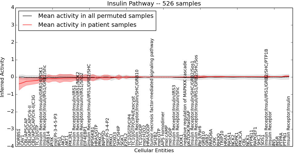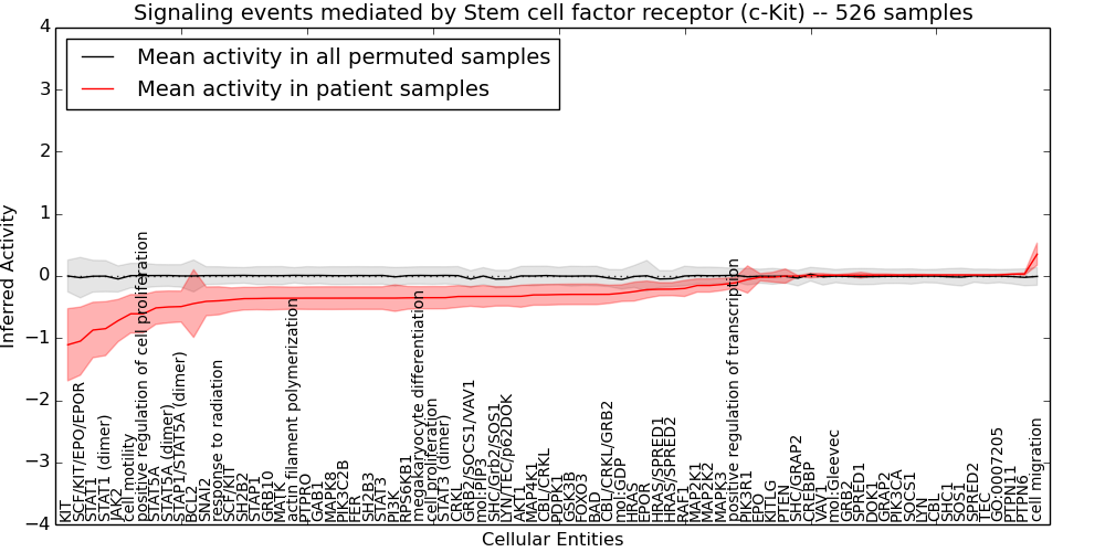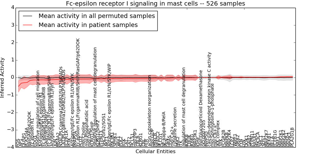Figure S131. Get High-res Image This plot shows pathway concept perturbations across all samples against a permutation model. The concepts along the x-axis are sorted by lowest to highest mean activity for the real patient samples. Mean inferred activities are plotted along the y-axis as a colored band showing the average level and one standard deviation range. Real samples are shown in red and permuted samples in black.