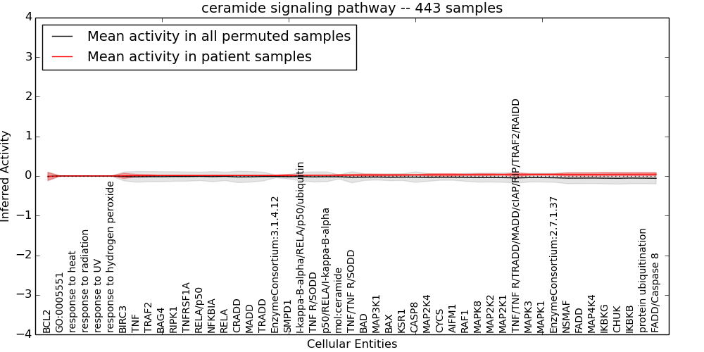 Figure S131. Get High-res Image This plot shows pathway concept perturbations across all samples against a permutation model. The concepts along the x-axis are sorted by lowest to highest mean activity for the real patient samples. Mean inferred activities are plotted along the y-axis as a colored band showing the average level and one standard deviation range. Real samples are shown in red and permuted samples in black.